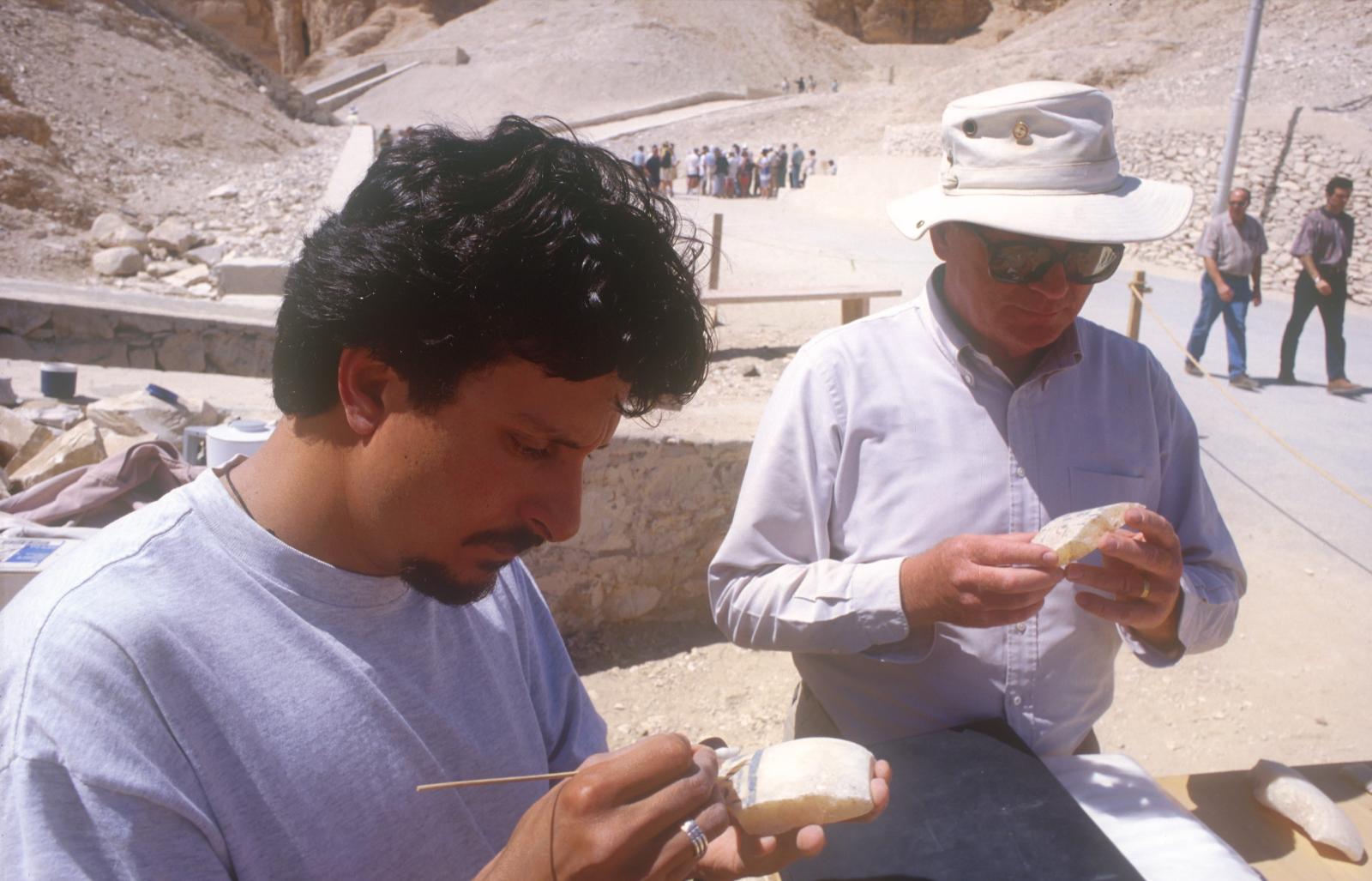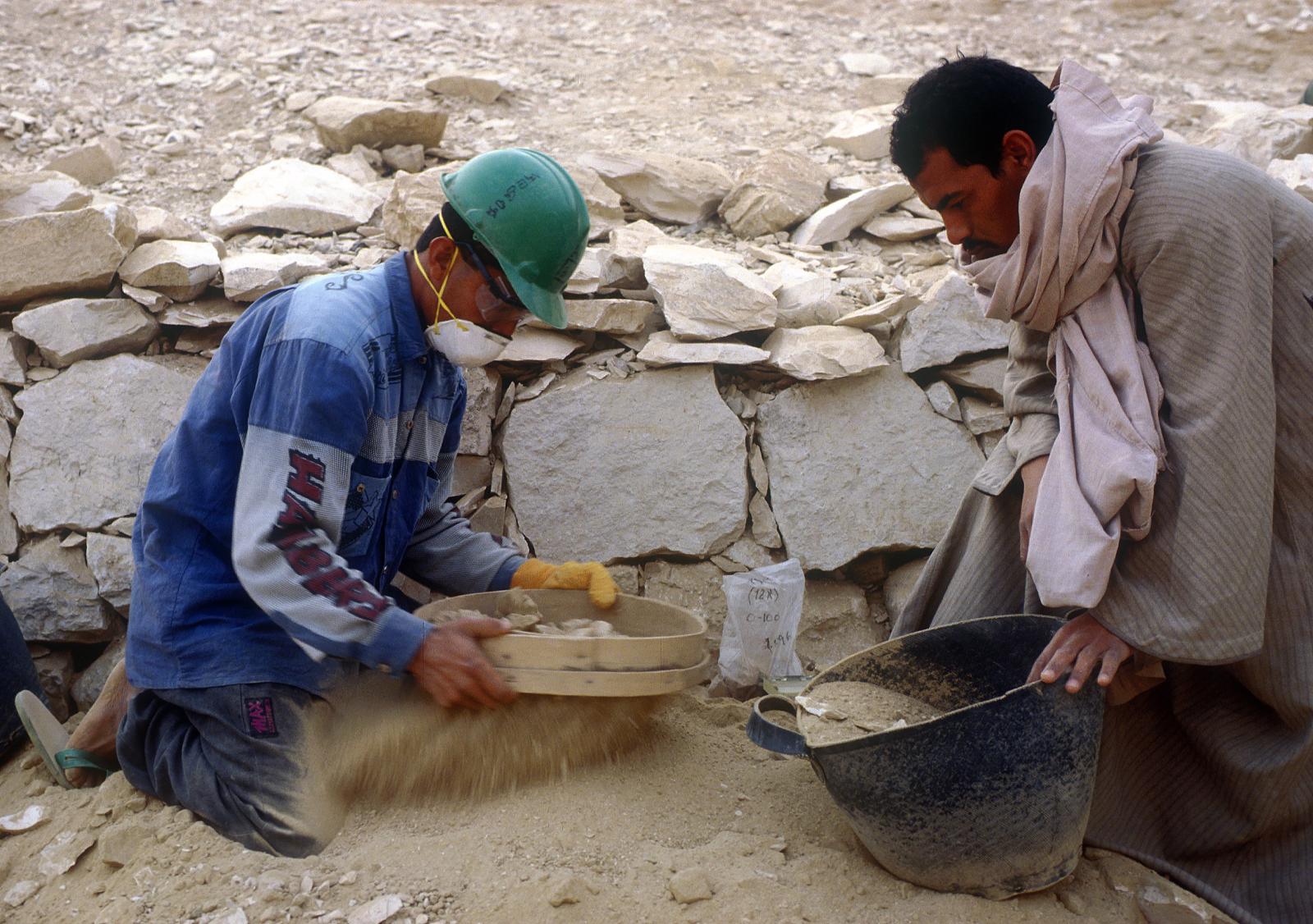 In KV 5, we never have more than two workmen digging at a time, in order to keep careful control of their progress. But depending on how far we are inside the tomb, as many as thirty men will form a bucket brigade to carry the debris up to the surface. Our workmen are recruited from nearby villages and many have worked for us for many years. Once the debris has been removed from the tomb, it is sifted to make sure no objects, however small, are missed.