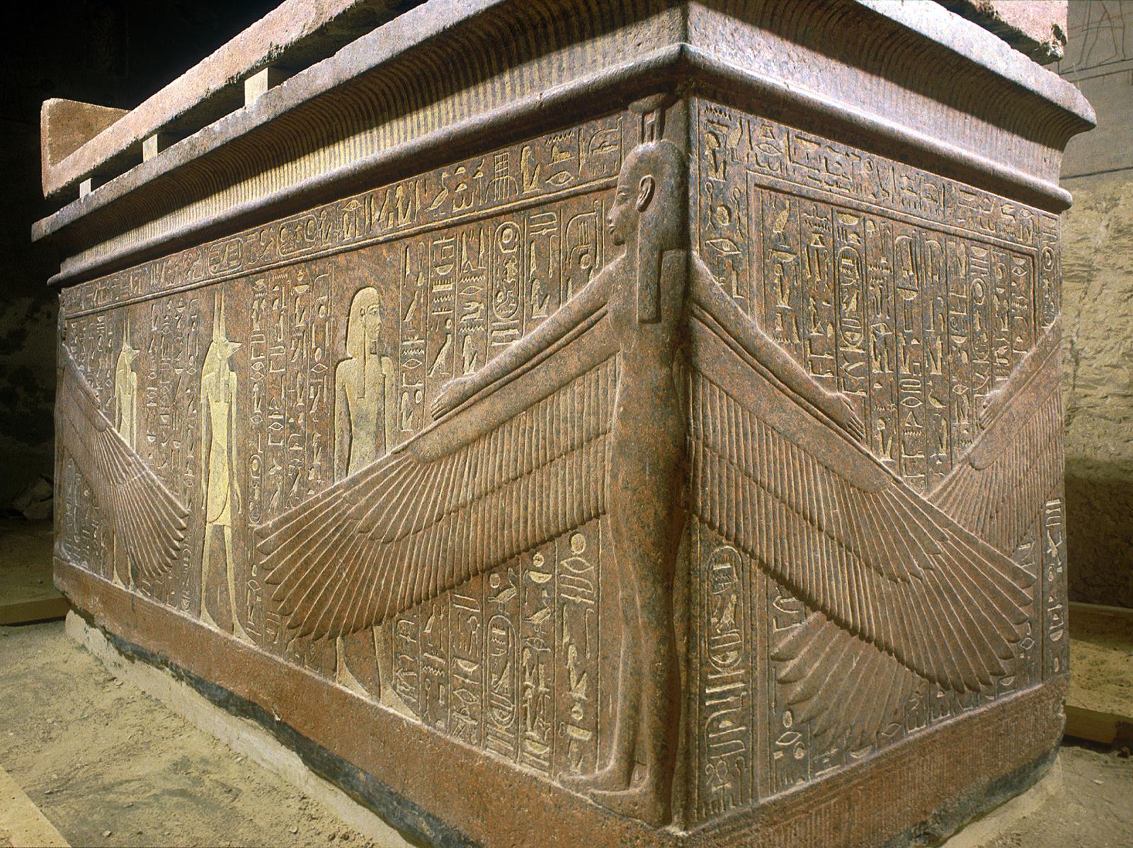The sarcophagi of the Dynasty 18 kings, through the reign of Amenhetep III, were cartouche-shaped in plan, with representations of Anubis and the four sons of Horus on the sides, Isis and Nephthys on the foot and head ends, and Nut on the lid. Royal sarcophagi from the Amarna period to the end of the dynasty revert to the rectangular shape with figures of protective goddesses sculpted on the corners.