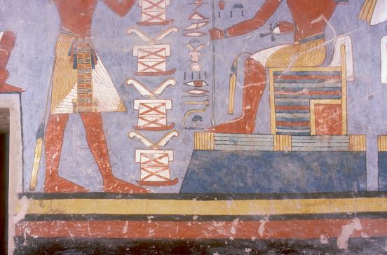 Meret chests, always four in number, contained colored cloth and were distinguished by a crossed pair of ostrich feathers over each chest. The cloth was supposed to represent the mummy wrappings of the god Osiris with whom the deceased king was identified.