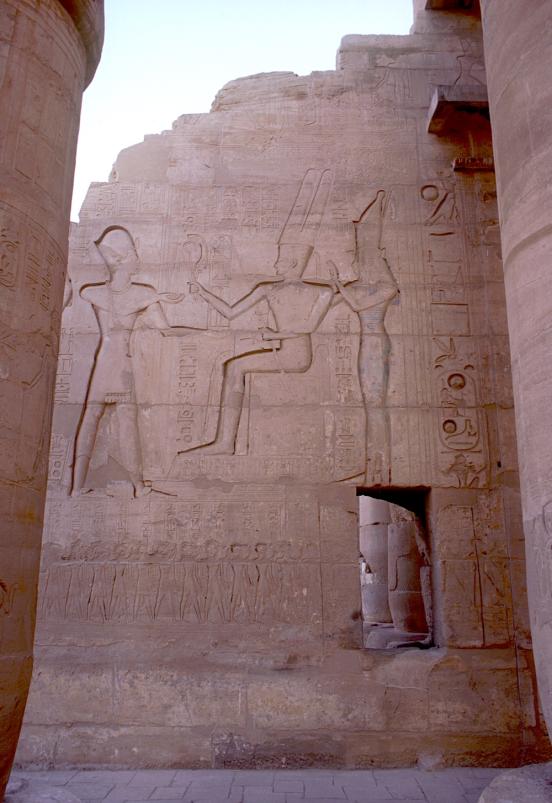 As a member of the Theban Triad, which also consisted of her husband Amen and son Khonsu, the vulture goddess Mut was seen as the divine mother of the king. She is usually represented as a woman wearing a long dress and a vulture headdress surmounted by the white crown of Upper Egypt or the Double crown of Upper and Lower Egypt, and holding a papyrus scepter symbolizing Upper Egypt. There is a temple dedicated to her at Karnak.
