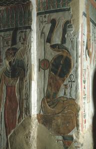 The winged Ma'at in the tomb of Nefertari, with the hieroglyphic sign of her name (an ostrich feather) on her wig. She protectively surrounds the deceased as the daughter of Re.