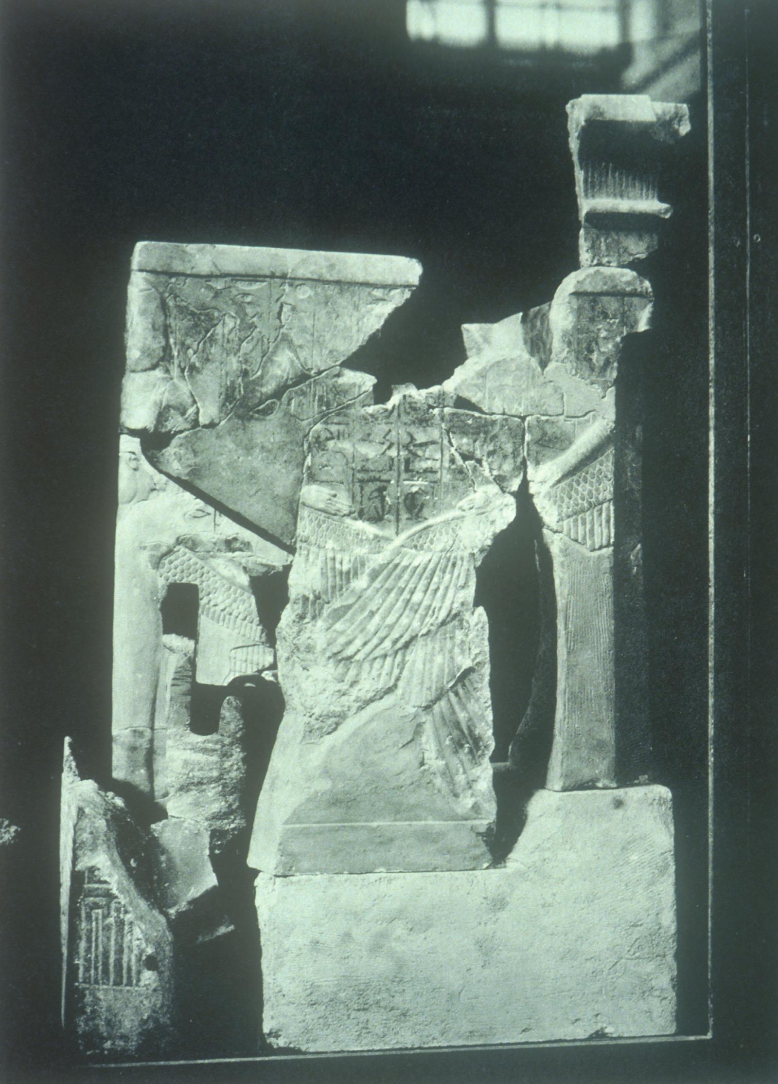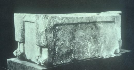 Partially reconstructed calcite canopic chest.
