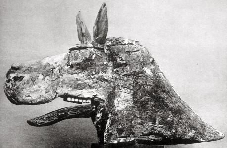 Wooden head of a jackal, originally with inlaid eyes, probably from a statue of Anubis.