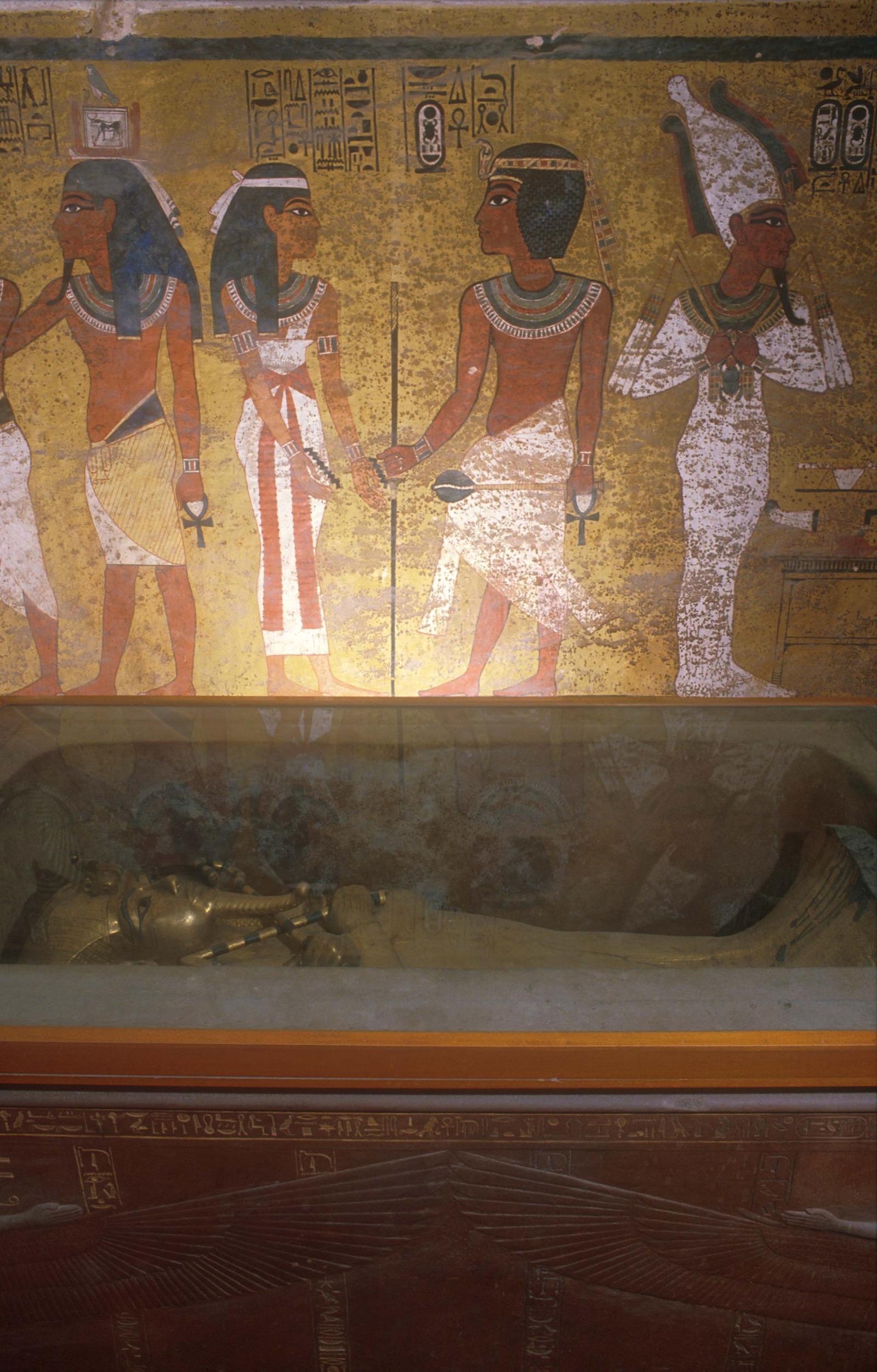 [Tutankhamen and] his ka, Nut greeting Tutankhamen, Tutankhamen as Osiris; outer coffin in sarcophagus.