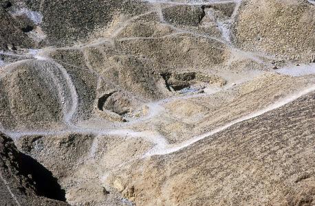 Trash on top of modern grating covering tomb entrance, surrounded by rubble wall to protect it from flooding.