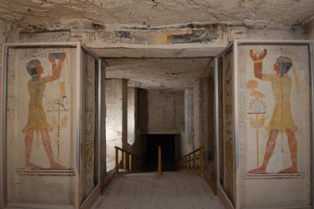 Tomb entrances and a modern tourist shelter.