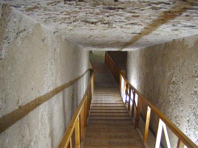Well chamber, with unfinished decoration, and staircase leading toward tomb entrance beyond.