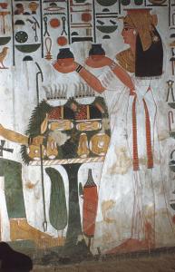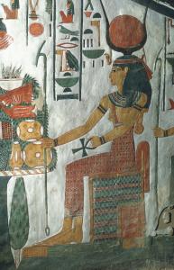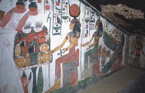 Nefertari presenting nu jars to Hathor seated on throne; star pattern on ceiling.