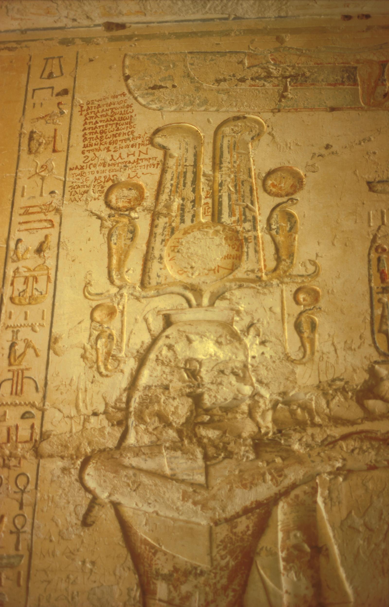 Rameses IV [addressing Ra-Horakhty], with Coptic graffiti around the figure.