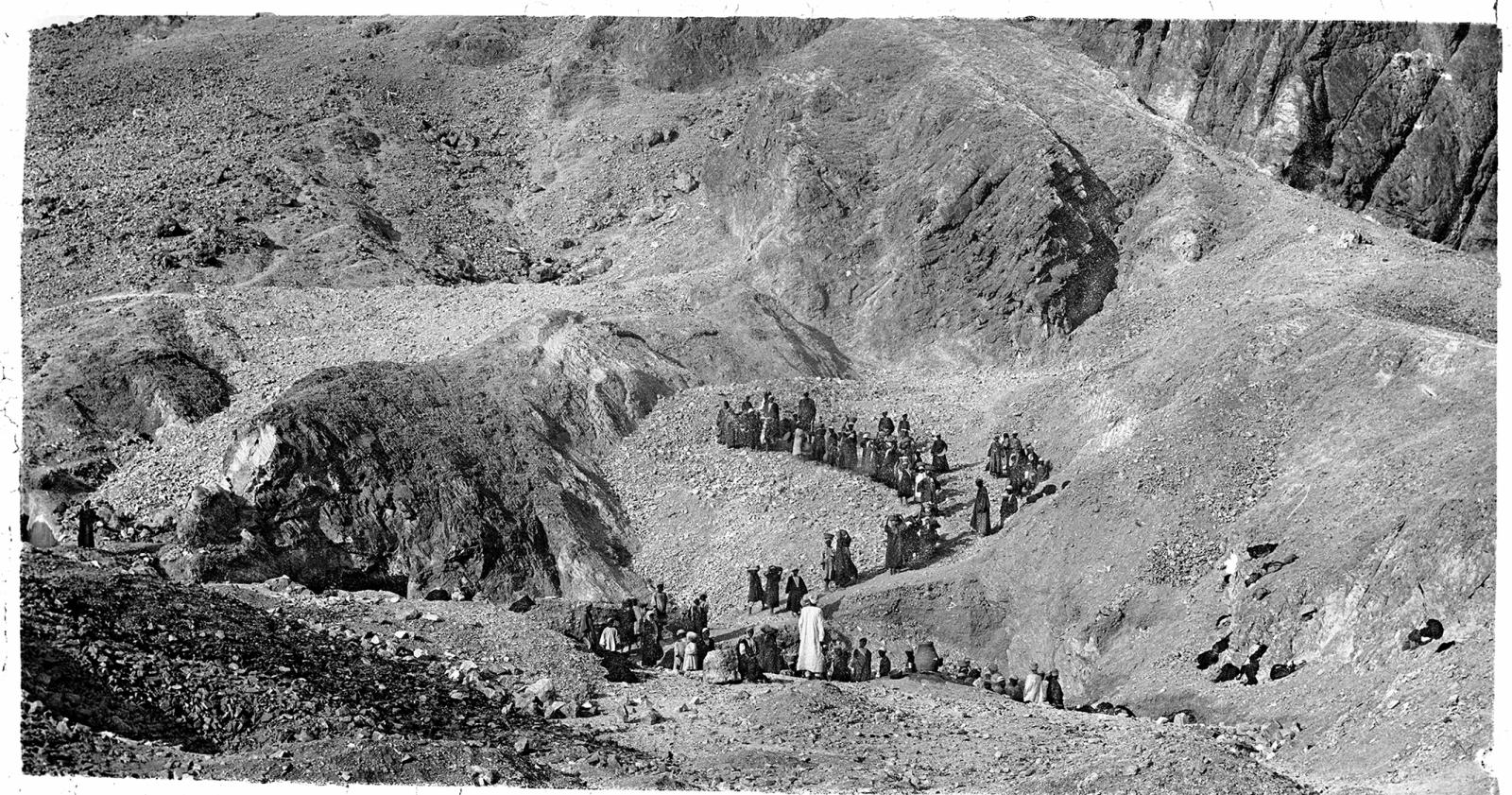 Excavating near the unfinished tomb (QV 45) dated to the 20th Dynasty. Italian Archaeological Expedition excavations. Courtesy of the Egyptian Museum in Turin.
