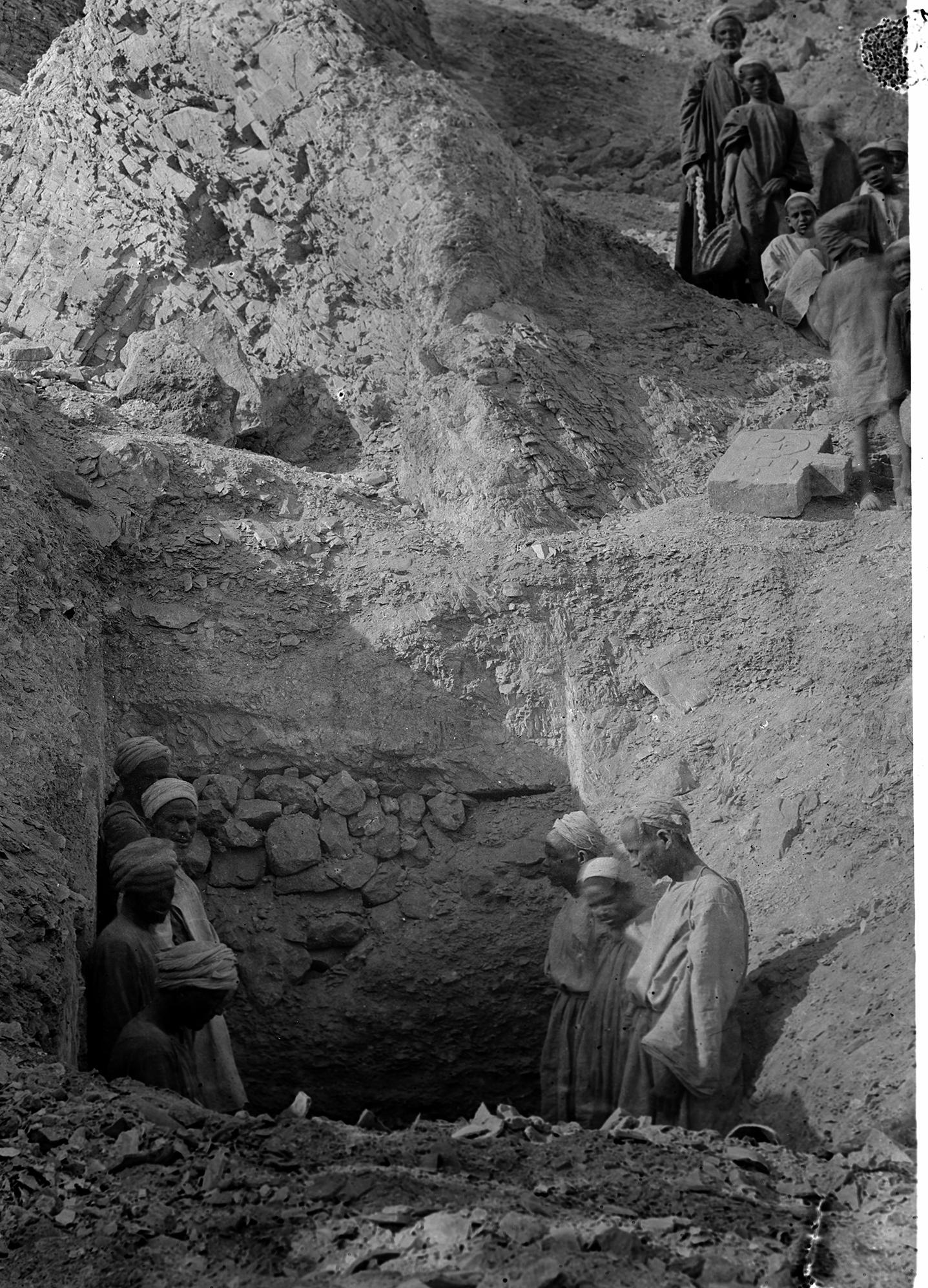 Access to the tomb of Prince Sethherkhepshef (QV 43) during Ernesto Schiaparelli's excavations. Italian Archaeological Expedition excavations. Courtesy of the Egyptian Museum in Turin.