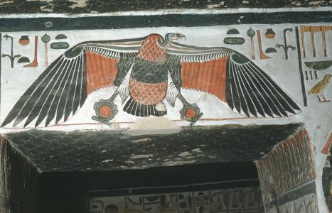 View of the east wall of chamber B's vestibule with access to side chamber Ba in the tomb of Queen Nefertari (QV 66) perhaps photographed during excavations. On the right, a seated dyad statue of Re-Horakhty and Hathor. On the left, Khepri. Italian Archaeological Expedition excavations. Courtesy of the Egyptian Museum in Turin.