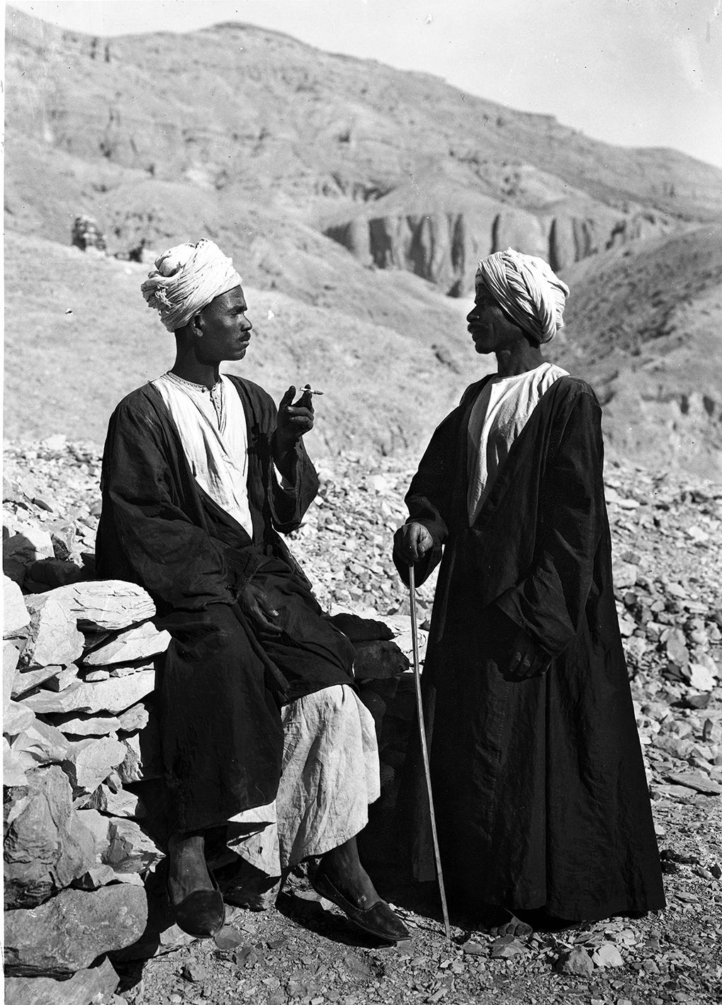 Workers photographed on break during Schiaparelli's excavations in a large wadi adjacent to the Valley of the Queens. Italian Archaeological Expedition excavations. Courtesy of the Egyptian Museum in Turin.