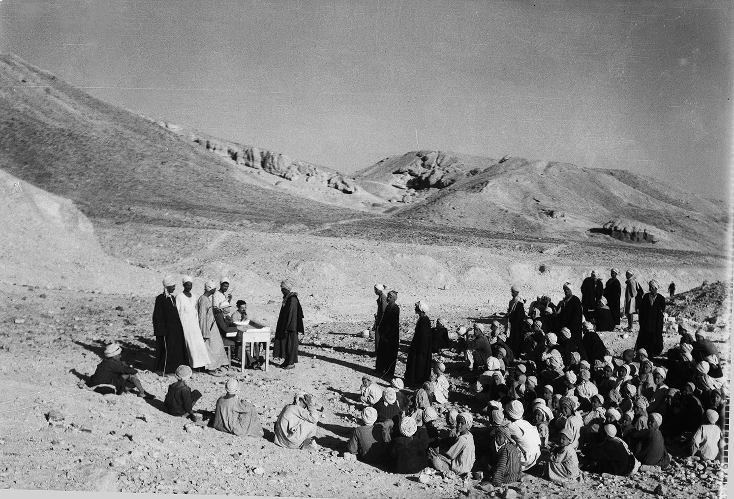 Workers received their pay during Farina's excavations in the Valley of the Queens. In the background is the path leading to Dayr al-Madinah. Italian Archaeological Expedition excavations. Courtesy of the Egyptian Museum in Turin.