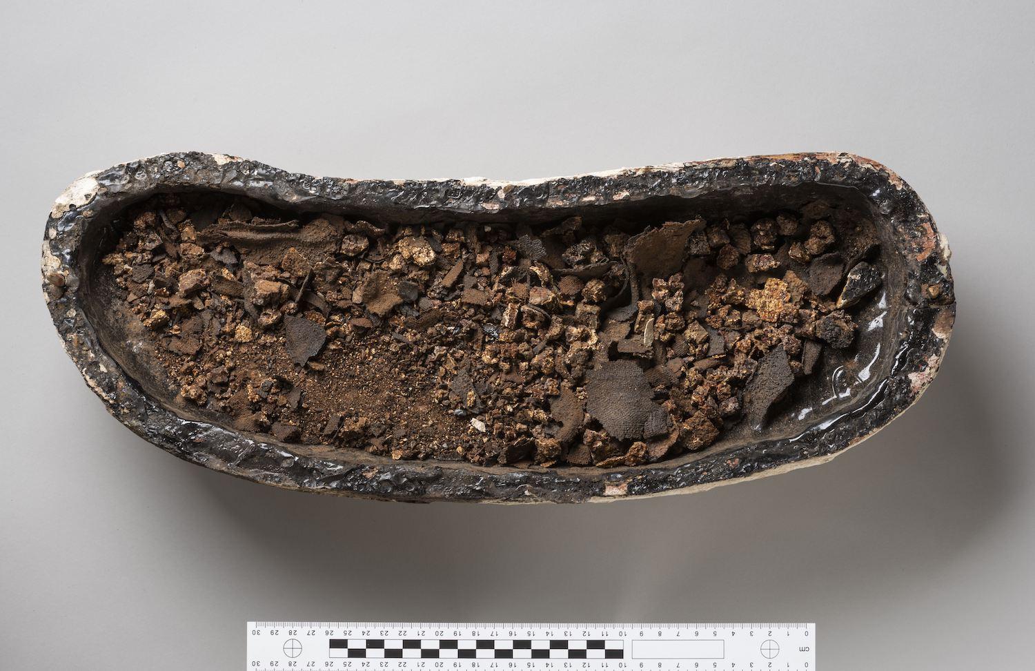 Interior view of a wooden container with the remains of a victual (food) mummy of beef thigh and rib meat from the tomb of Imhotep (QV 46). Courtesy of the Egyptian Museum in Turin (S.5087).