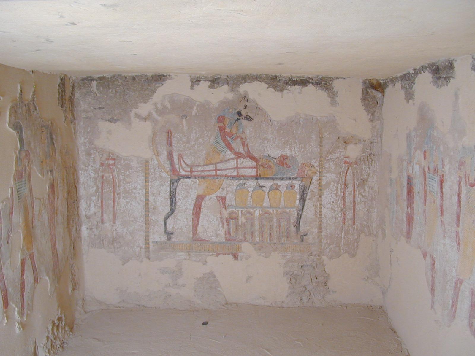 Side Chamber Ga rear wall. Book of the Dead, spell 151: the deity Anubis attends to a mummy on a bier with the goddesses Isis and Nephthys as principal mourners at the foot and head.