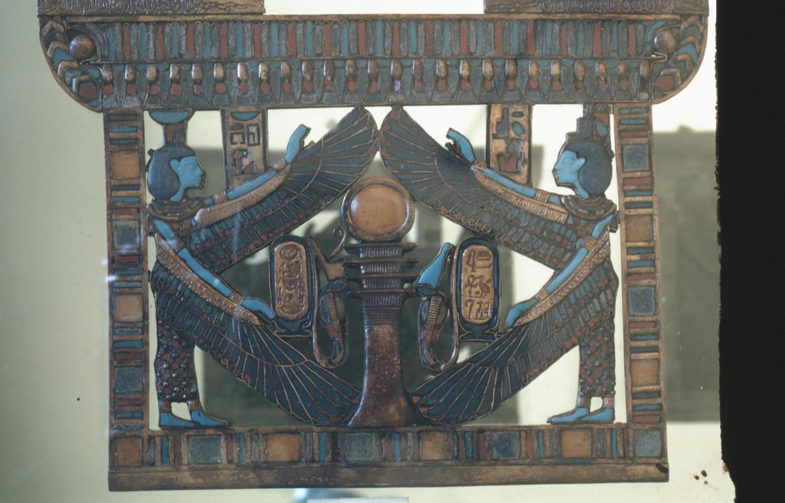 Pectoral, djed-pillar with cartouches of the king, protected by Isis and Nephthys (Cairo Museum). Courtesy of Uni Dia Verlag; Uni Dia Image Nr. 35510.