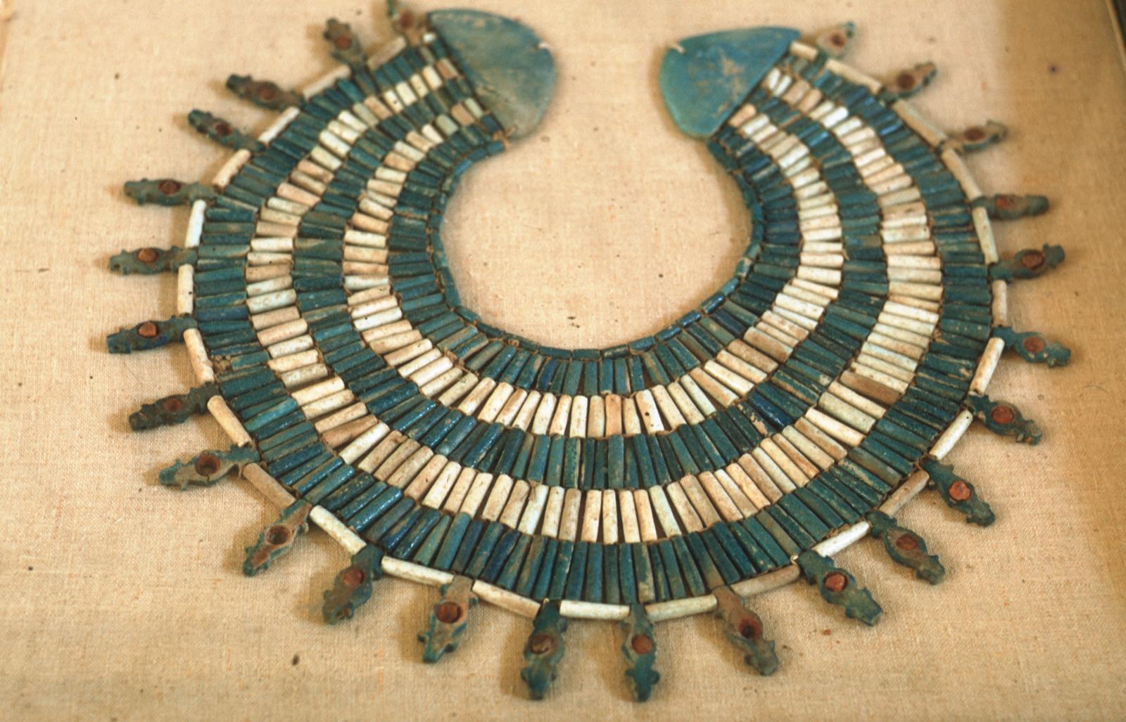 Wesekh-collar made from colored faience beads with some in the form of frogs (?) or crocodiles (?) with an inlaid sun disc (Cairo Museum). Courtesy of Uni Dia Verlag; Uni Dia Image Nr. 35539.