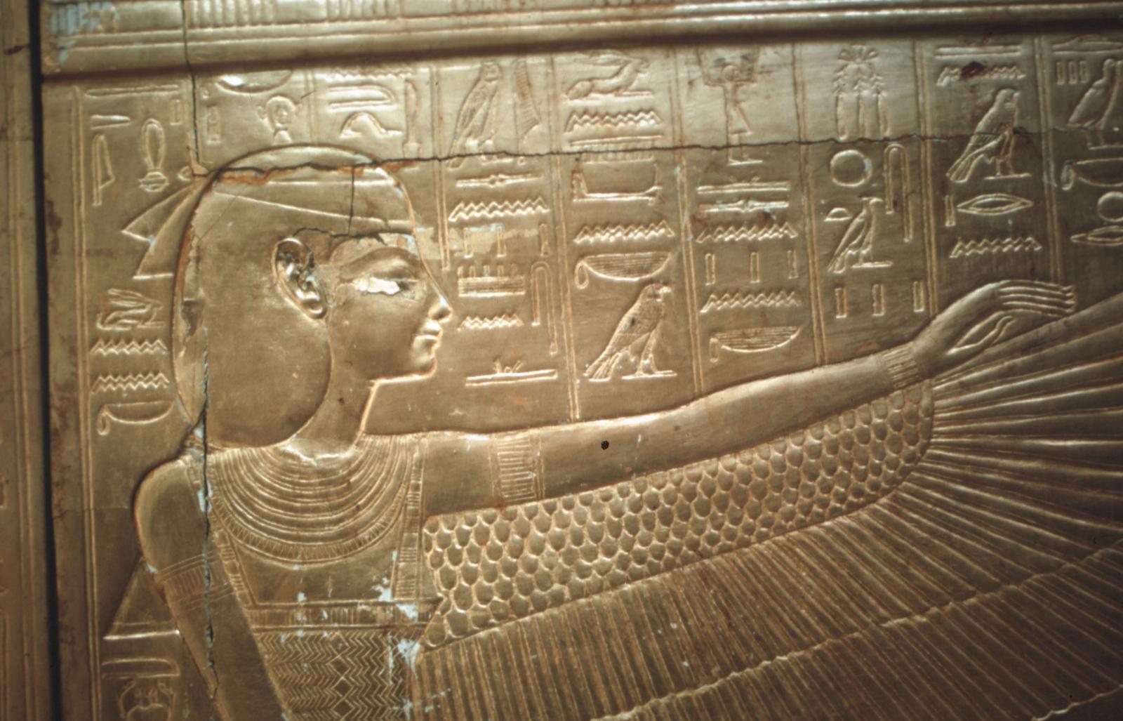 Details of the rear of the middle shrine with texts and an image of the goddess Nepthys with wings (Cairo Museum). Courtesy of Uni Dia Verlag; Uni Dia Image Nr. 35555.