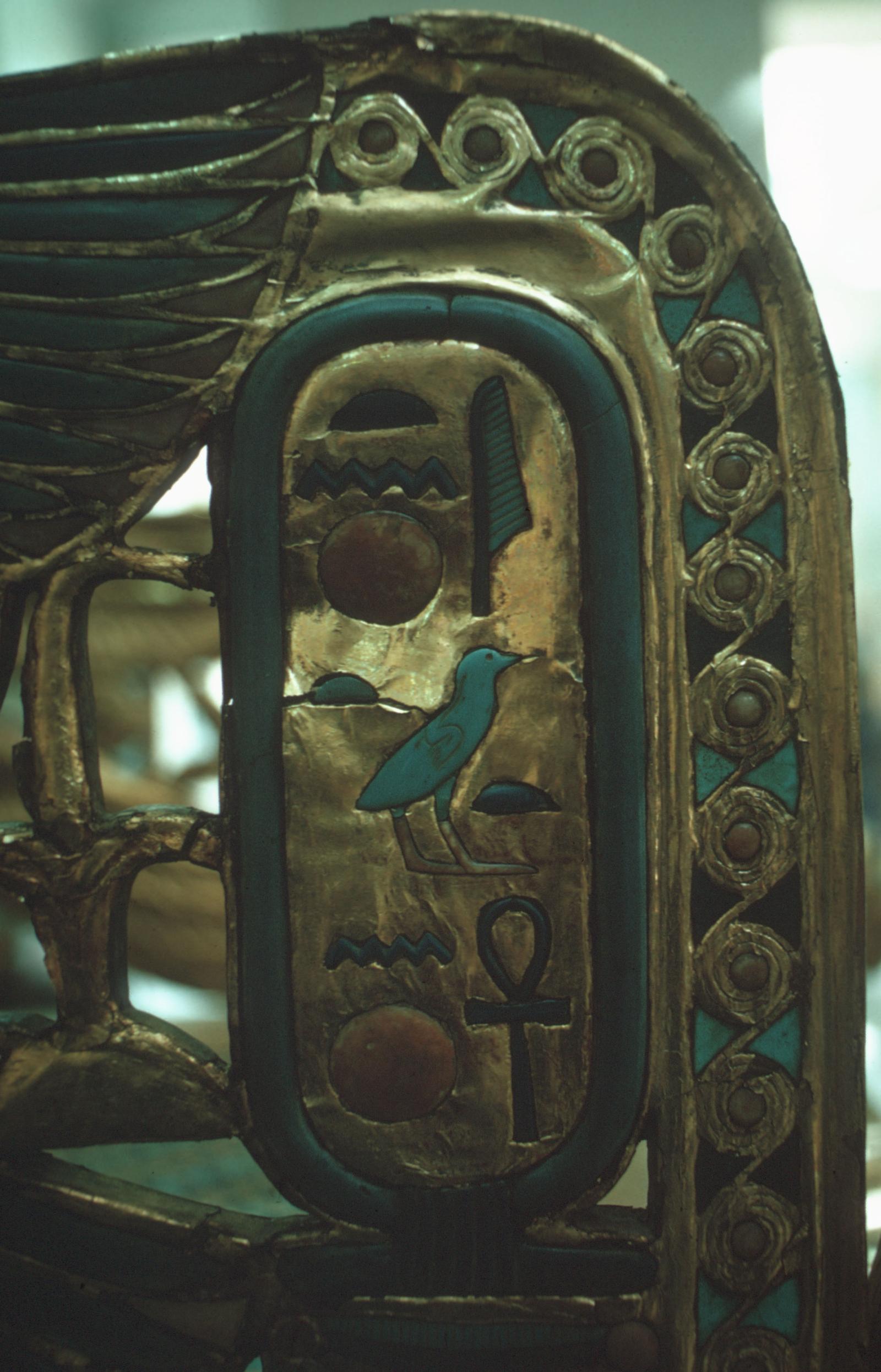 Detail from the arm of one of the king's thrones. Nomen of Tutankhamen, gilded gold leaf, wood, carnelian, lapis lazuli, faience, and semi-precious stone inlay (Cairo Museum). Courtesy of Uni Dia Verlag; Uni Dia Image Nr. 35560.