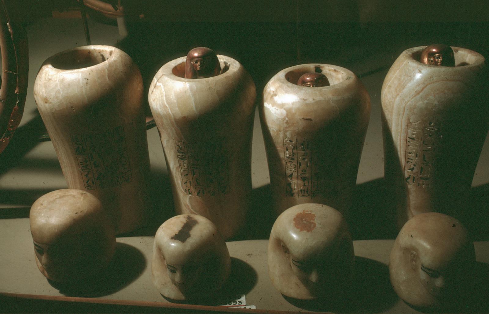 Set of four alabaster canopic jars with text and fitted with copper and gold shabtis (Cairo Museum). Courtesy of Uni Dia Verlag; Uni Dia Image Nr. 35573.