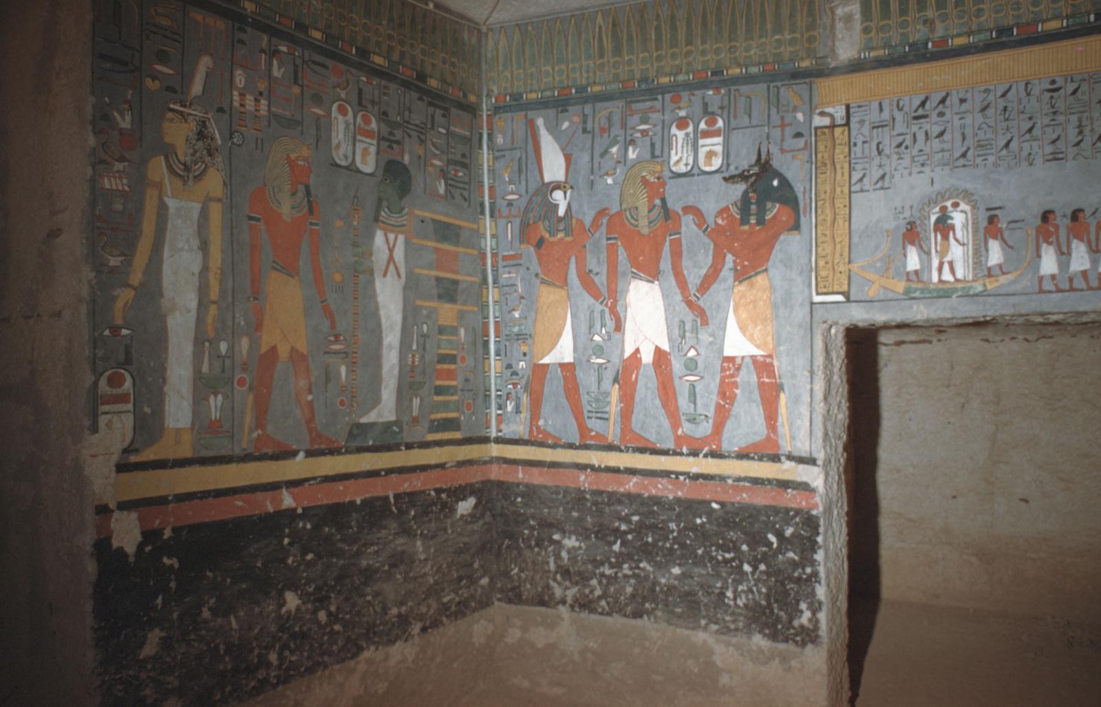 View of the southern corner and Gate Ja - the king before the god Ptah and djed-pillar (front wall, right part). The king flanked by the gods Horus and Anubis (left wall, right part), Book of Gates, third division (P)/fourth hour (H), middle register, scenes 18 and 19 (left wall above Gate Ja). Courtesy of Uni Dia Verlag; Uni Dia Image Nr. 35652.