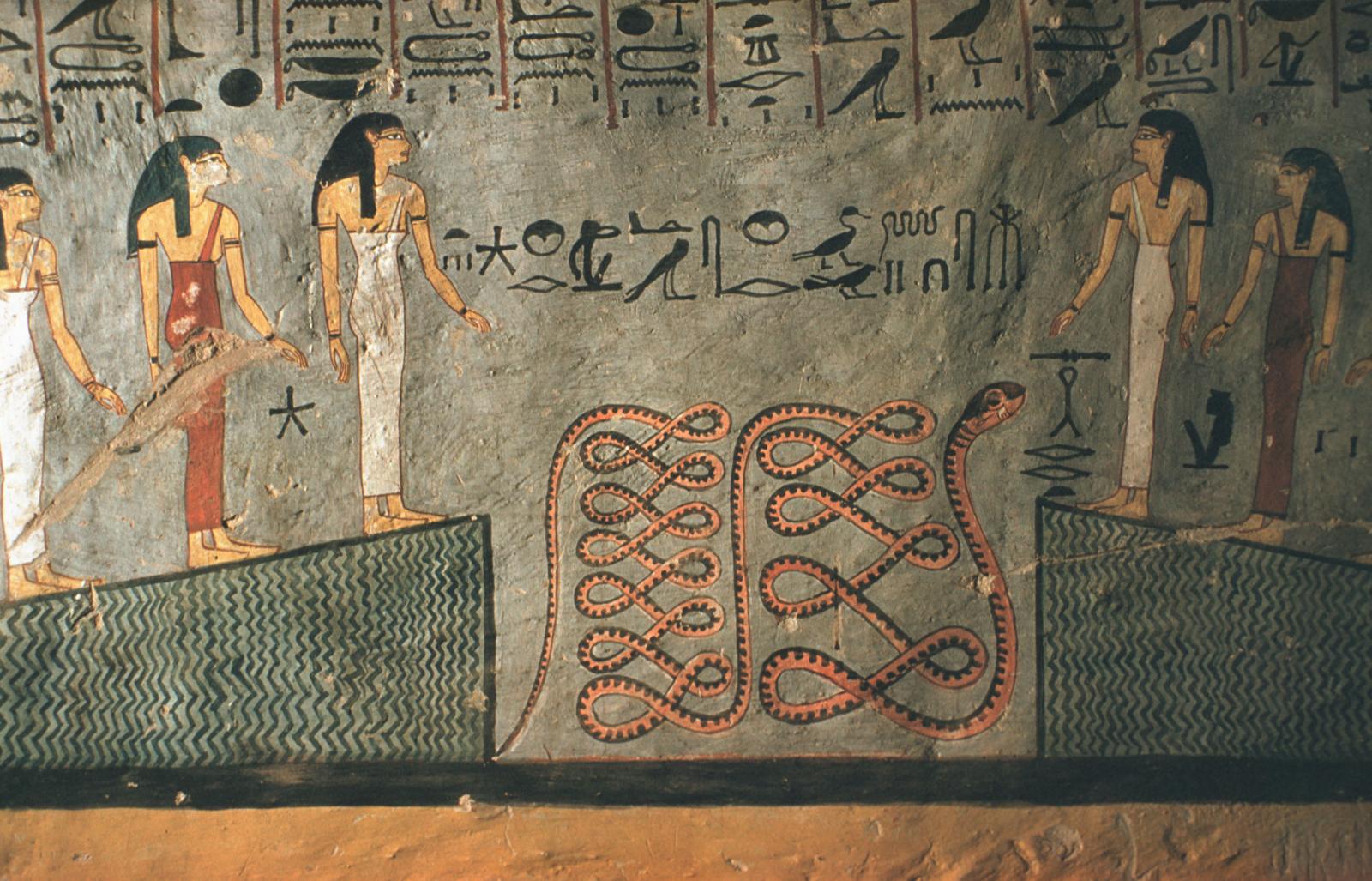 Detail of snake guarding river crossing in the hereafter; Book of Gates, third division (P)/fourth hour (H), middle and lower registers, scenes 19 and 20 - Burial chamber J, left wall. Courtesy of Uni Dia Verlag; Uni Dia Image Nr. 35654.