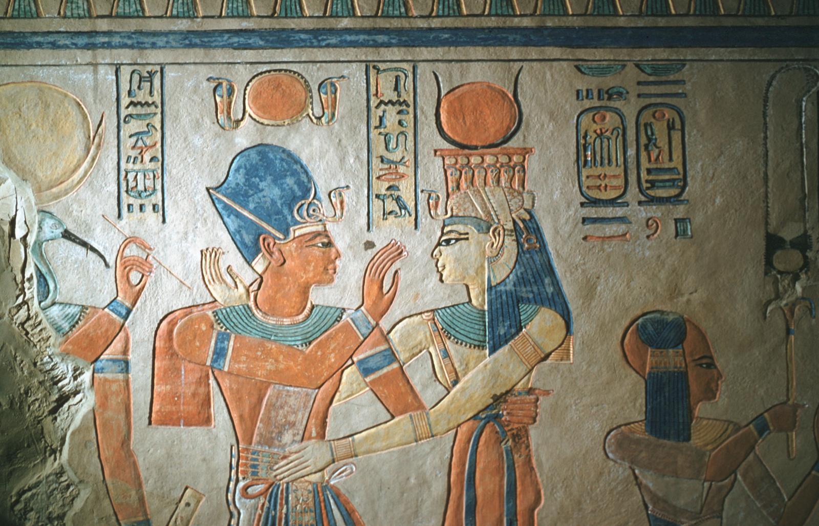 The king embraced by the goddess Isis flanked by the god Thoth, Chamber B, front wall (left part). Courtesy of Uni Dia Verlag; Uni Dia Image Nr. 36622.