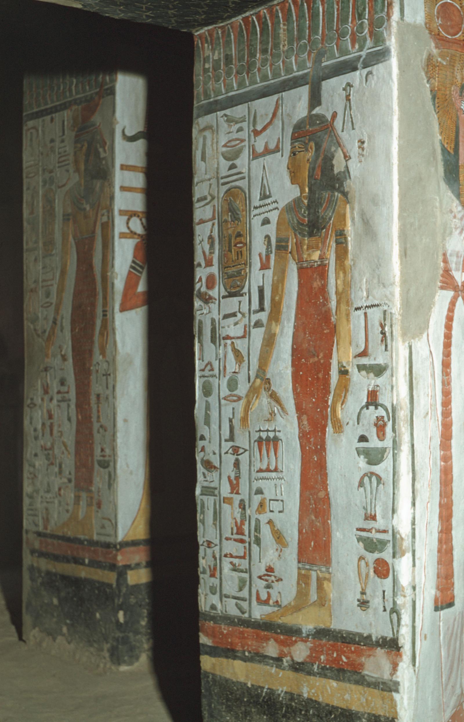View from Side Chamber Ba, the goddess Ma'at on the left thickness of Gate Ba and the goddess Serqet in the background on the large recess of Chamber B. Courtesy of Uni Dia Verlag. Uni Dia Image Nr. 36826.