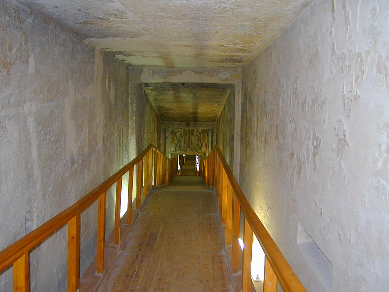 Corridor C looking toward Gate D and Corridor D and the rear wall of Chamber F featuring the deities Horus and Anubis before Osiris. Courtesy of Richard Sellicks.