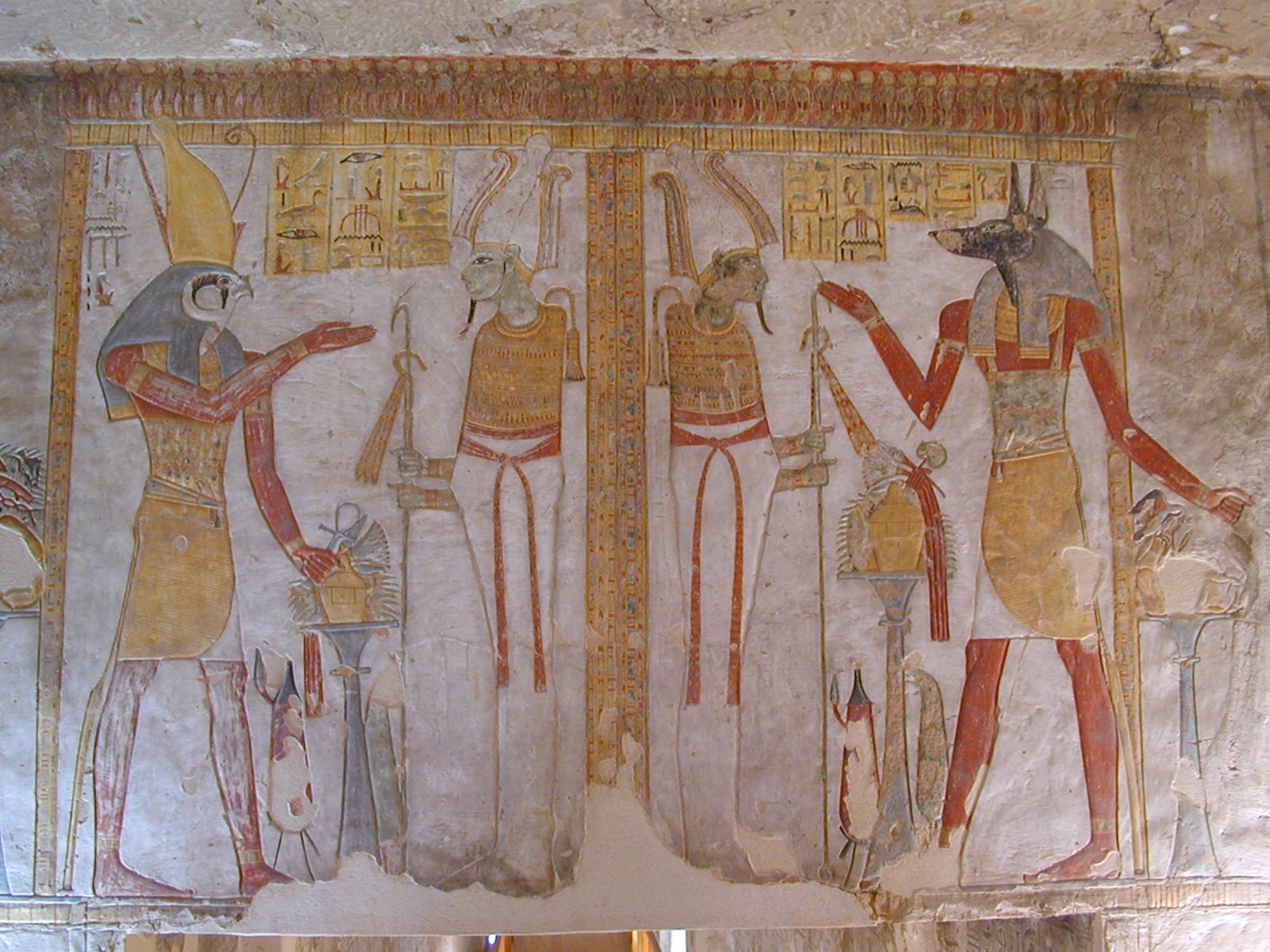 The rear wall of Chamber F. The deities Horus and Anubis before Osiris. Courtesy of Richard Sellicks.