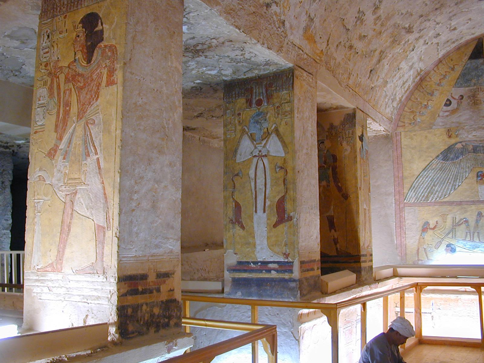 Burial chamber J1, front, left part. Pillars with the deity Osiris in a hemhem-crown beside two imiut-fetishes; the deities Anubis and Horus. Front, right part, pillar with Pharaoh Setnakht. Courtesy of Richard Sellicks.