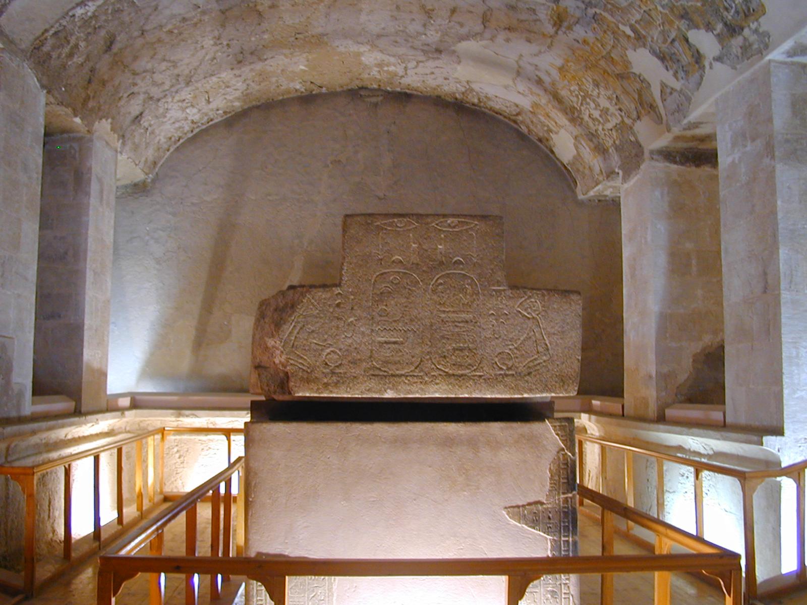 Burial chamber J2, sarcophagus, left face. Cartouches of Setnakht and the deities Isis and Nephthys in mourning. Courtesy of Richard Sellicks.