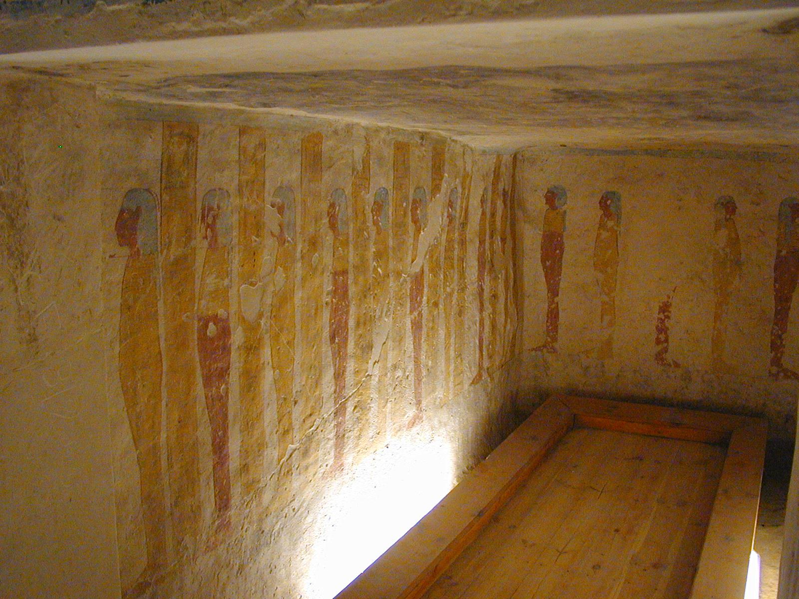Rear and left walls of Side chamber Ka. Mummified figures of the king representing shabti figures. Courtesy of Richard Sellicks.