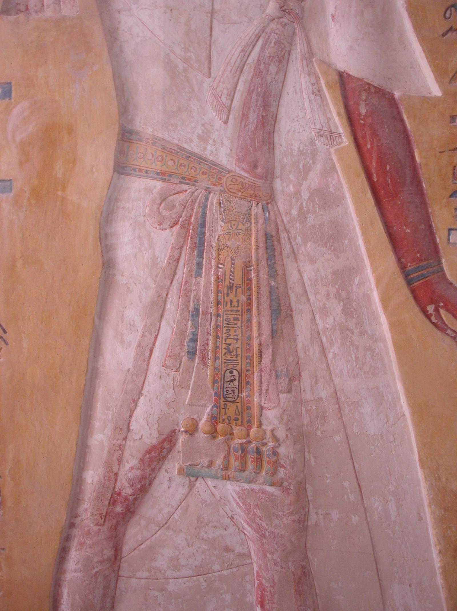 Corridor B, left wall. Detail of the king's kilt and sporran. Siptah receives eternal life (ankh) from the syncretic deity Ra-Horakhty. Courtesy of Richard Sellicks.