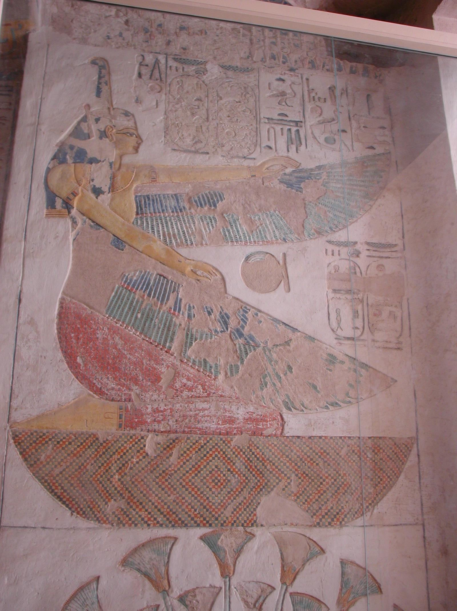 Gate B, right thickness. The winged deity Ma'at kneels on an nb-basket atop papyrus sedges.