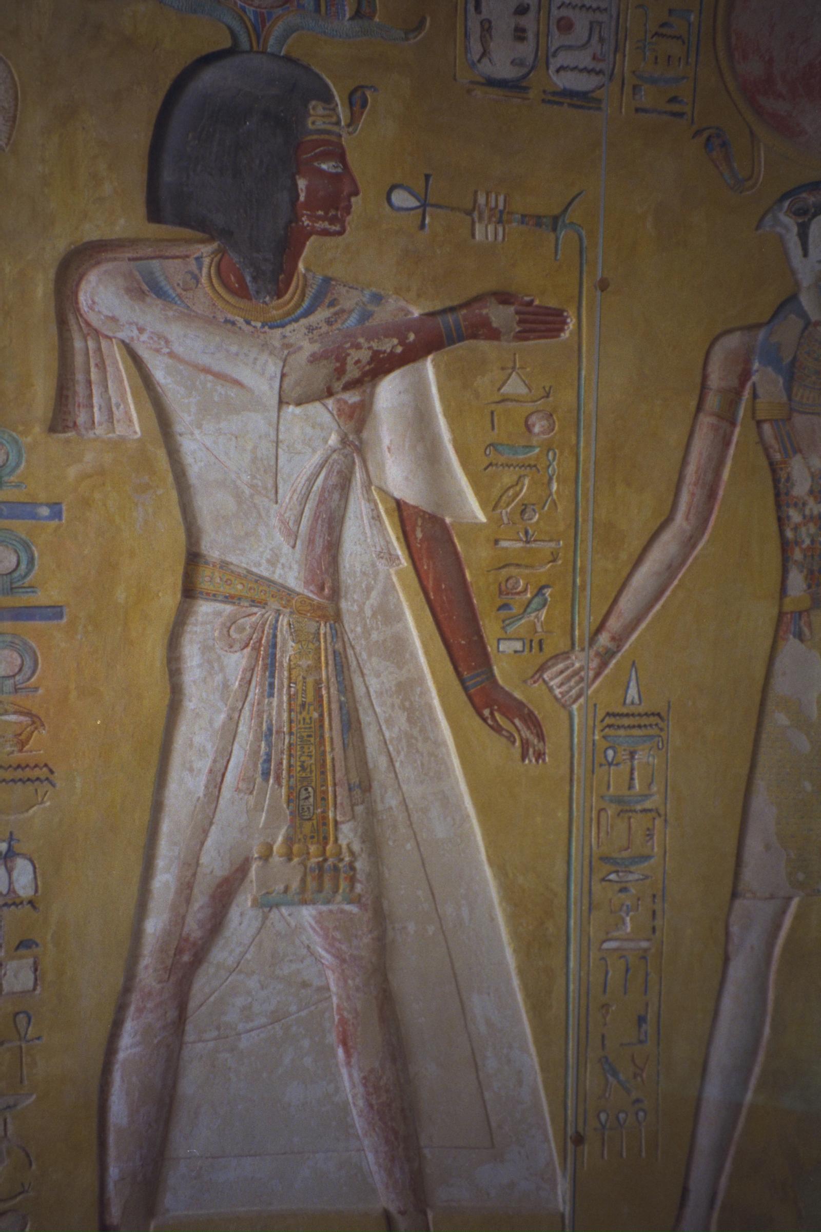 Corridor B, left wall. Siptah receives eternal life (ankh) from the syncretic deity Ra-Horakhty. Courtesy of Richard Sellicks.