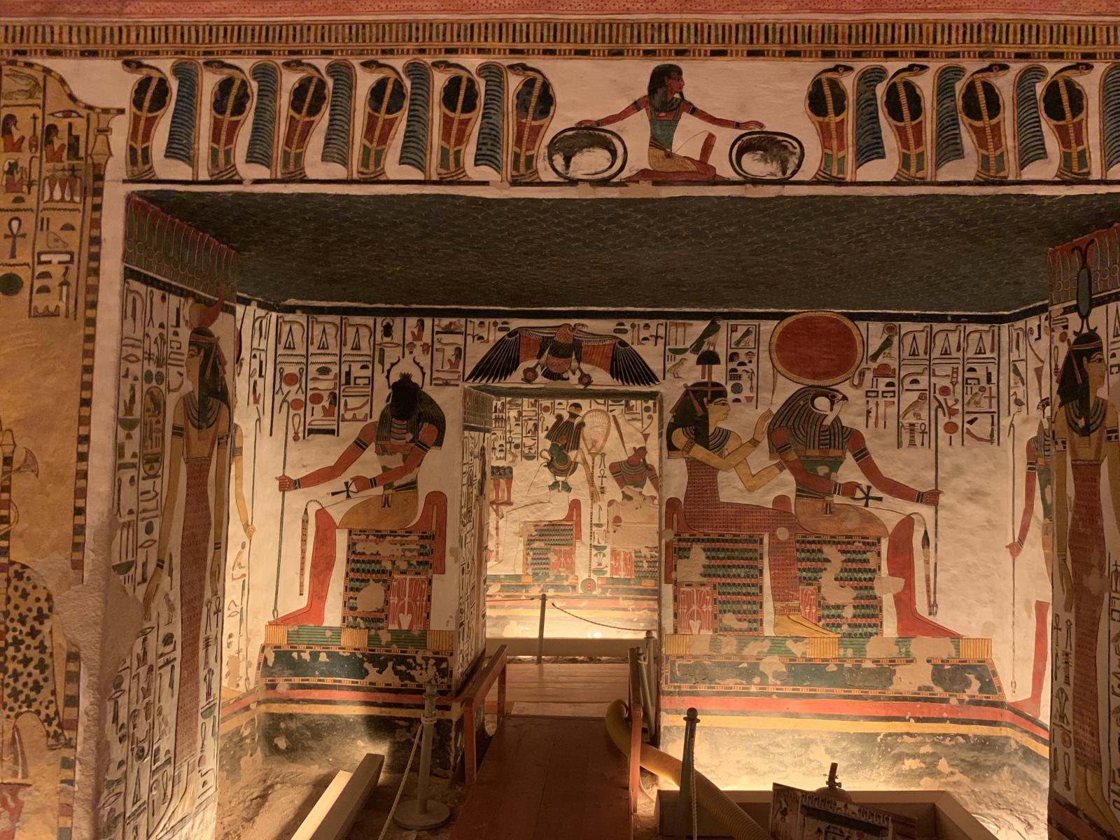 Chamber B, vestibule, right lintel, Deity holding wedjat-eyes, flanked by a row of uraei and ostrich feathers; deities Serqet, Neit, Khepri, Hathor, and Ra-Horakhty. Side chamber Ba rear wall, Osiris and Atum. Courtesy of Richard Sellicks.