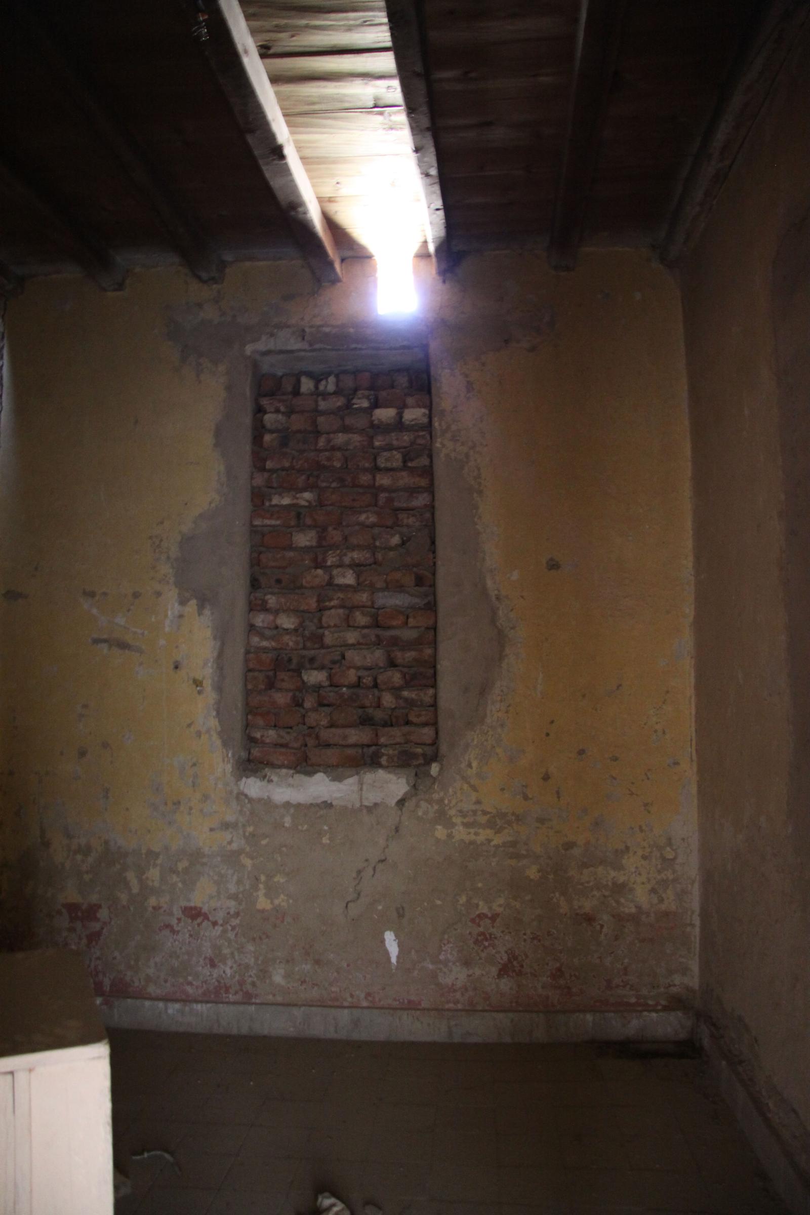 Wood slats making up the ceiling and roof of the Mond and Davies House and doorway blocked by bricks. Courtesy of Marcel and Monica Maessen