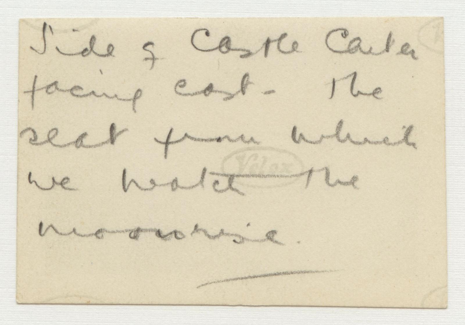 Postcard featuring a photograph of Carter House, from Phyllis Walker's collection. Recto of PJEL_DH_0004. Caption: "Side of Castle Carter facing east - the seat from which we watch the moonrise." Courtesy of the Peggy Joy Egyptology Library.