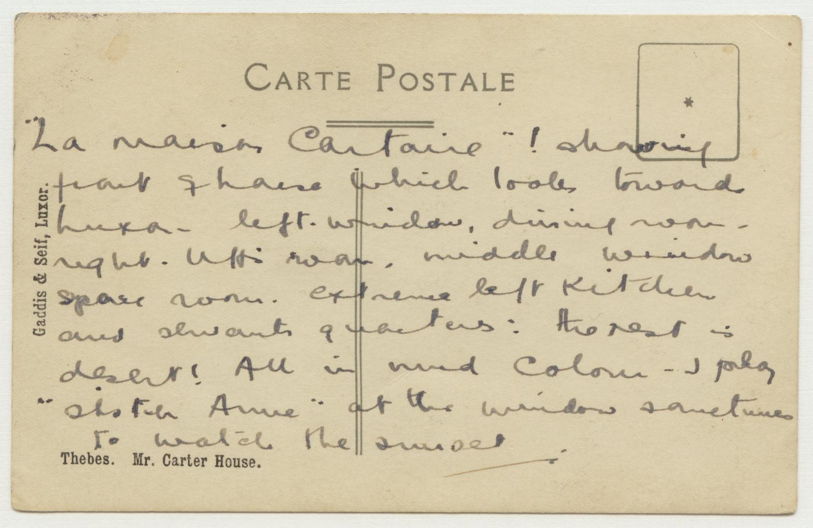 Postcard featuring a photograph of Carter House, from Phyllis Walker's collection. Recto of PJEL_DH_0008. Caption: La maison Cartaire"! showing front of house which looks toward Luxor. left window, dining room, right. U H's room, middle window spare room. extreme left kitchen and servants quarters: the rest is desert! All in mud colour. I play "Sister Anne" at the window sometime to watch the sunset." Courtesy of the Peggy Joy Egyptology Library.