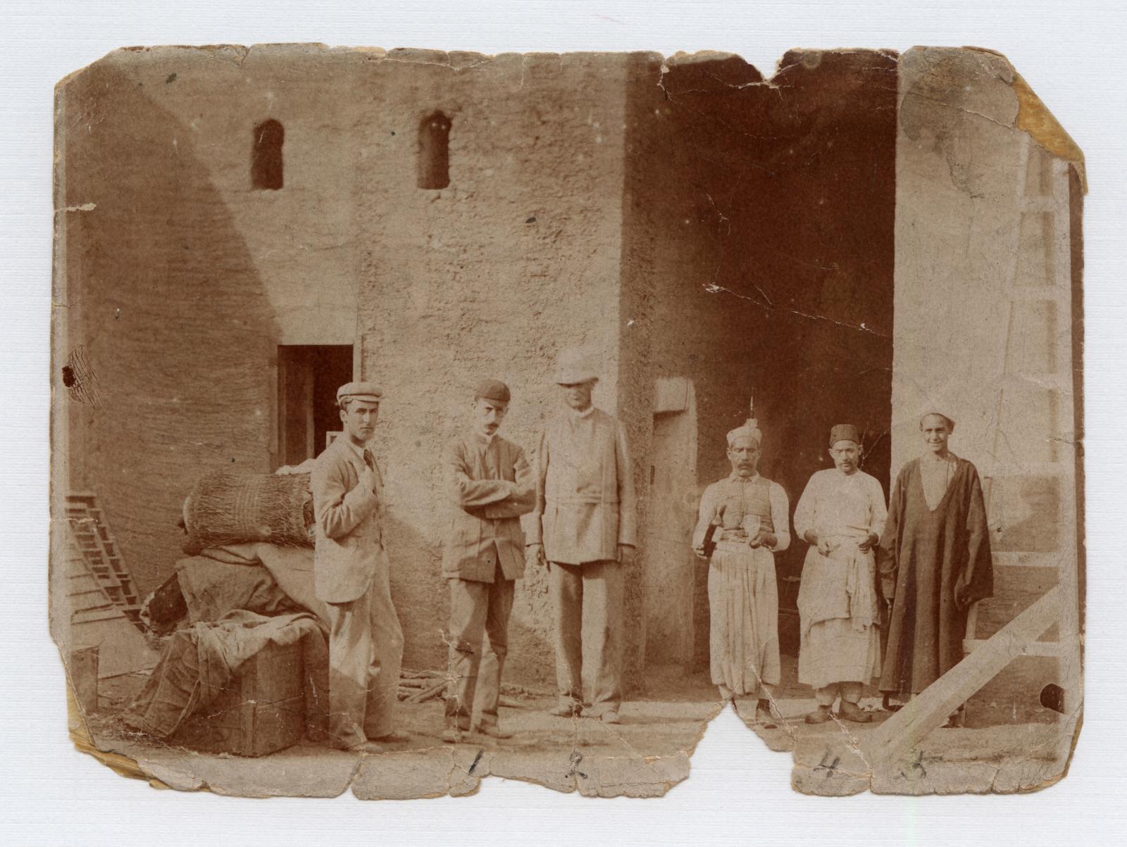 Photograph outside the Egypt Exploration Fund dig house near Dayr al-Bahri. John Newberry, Edouard Naville, Howard Carter, Abdul Maleih, Said Gaddiz, and Shehate. Courtesy of the Peggy Joy Egyptology Library.