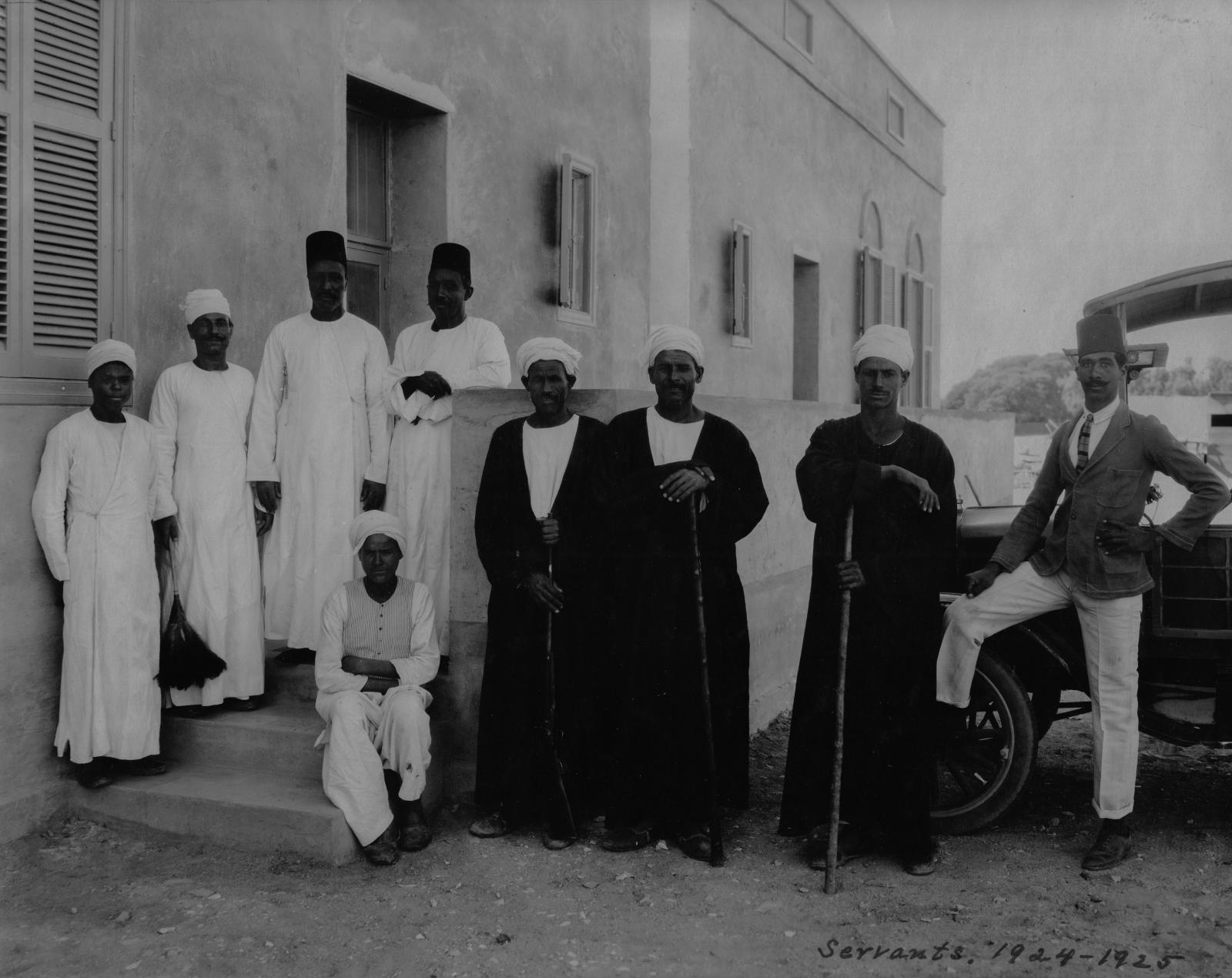Old Chicago House. Staff photo 1924-1925. Egyptian staff: on the right, Mahmoud (the driver), Abd el-Qader, Ali, Abu'l Hakim (with gun), Mahmud and Hiya (with tarbush). Seated, Selim. Epigraphic Survey Negative 1092. Courtesy of the Institute for the Study of Ancient Cultures of the University of Chicago.