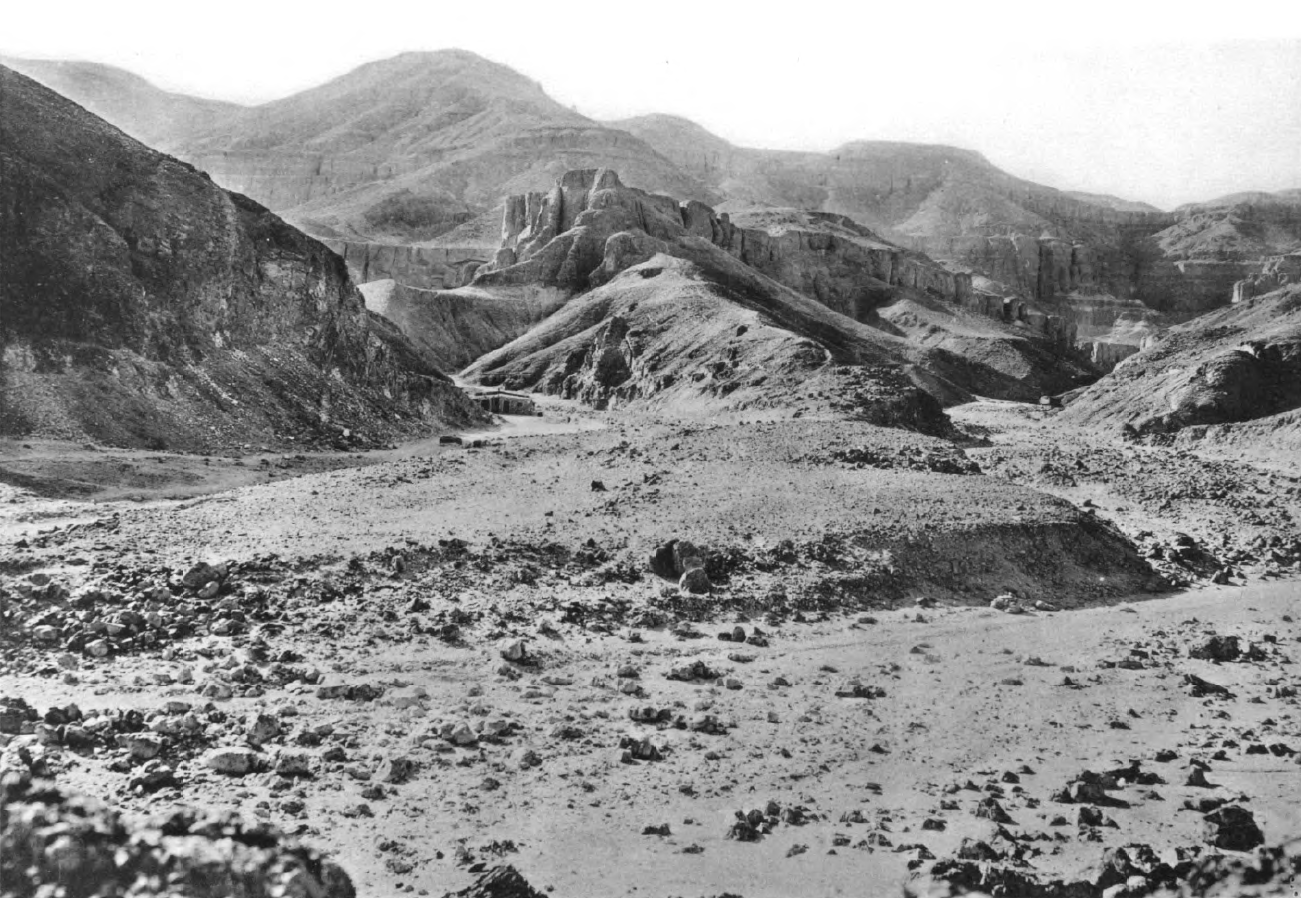 Distant view of Davis House situated in the Western Valley. Davis, Theodore M. The Tombs of Harmhabi and Touatânkhamanou: The Discovery of the Tombs. London: Constable and Company Ltd., 1912, pl. XIX.