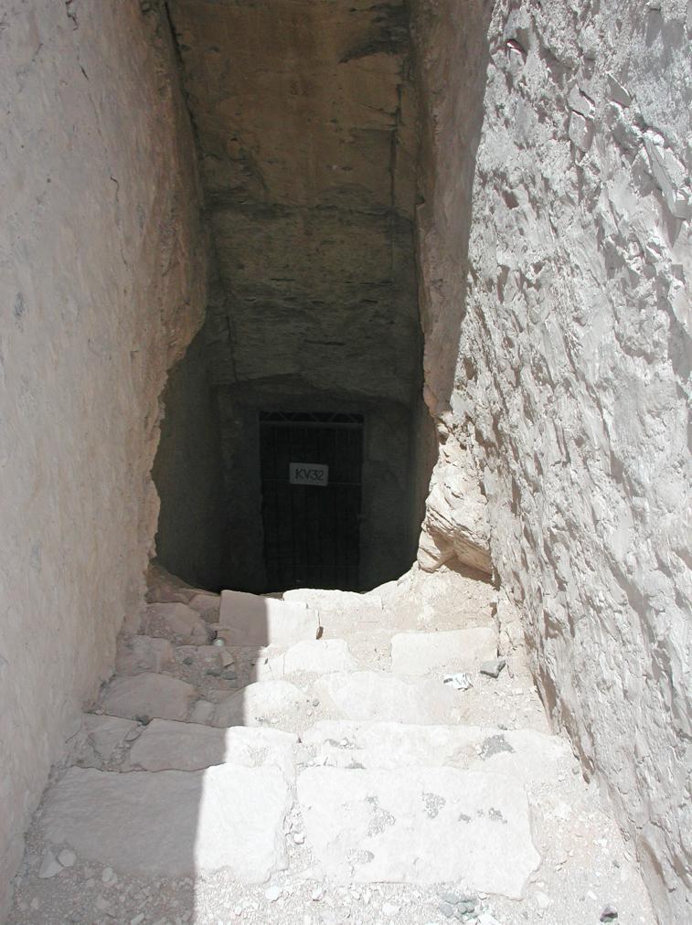 KV 32 was never finished, and was not decorated. It has been excavated by the MISR Project: Mission Siptah-Ramses X of the University of Basel. The mission recently discovered a Canopic chest of Queen Tia'a, wife of Amenhetep II and mother of Thutmes IV, thus allowing the tomb owner to be identified.