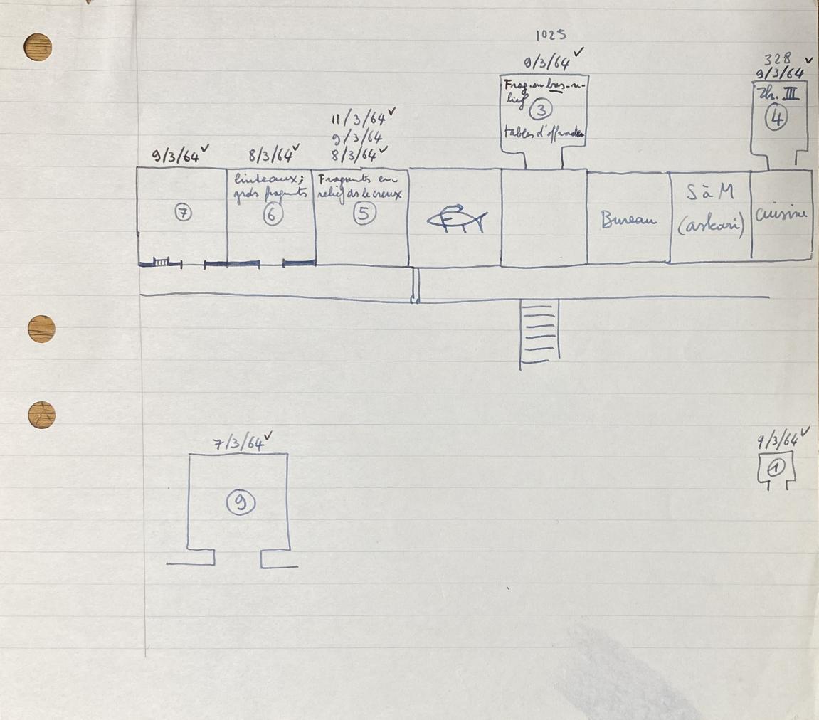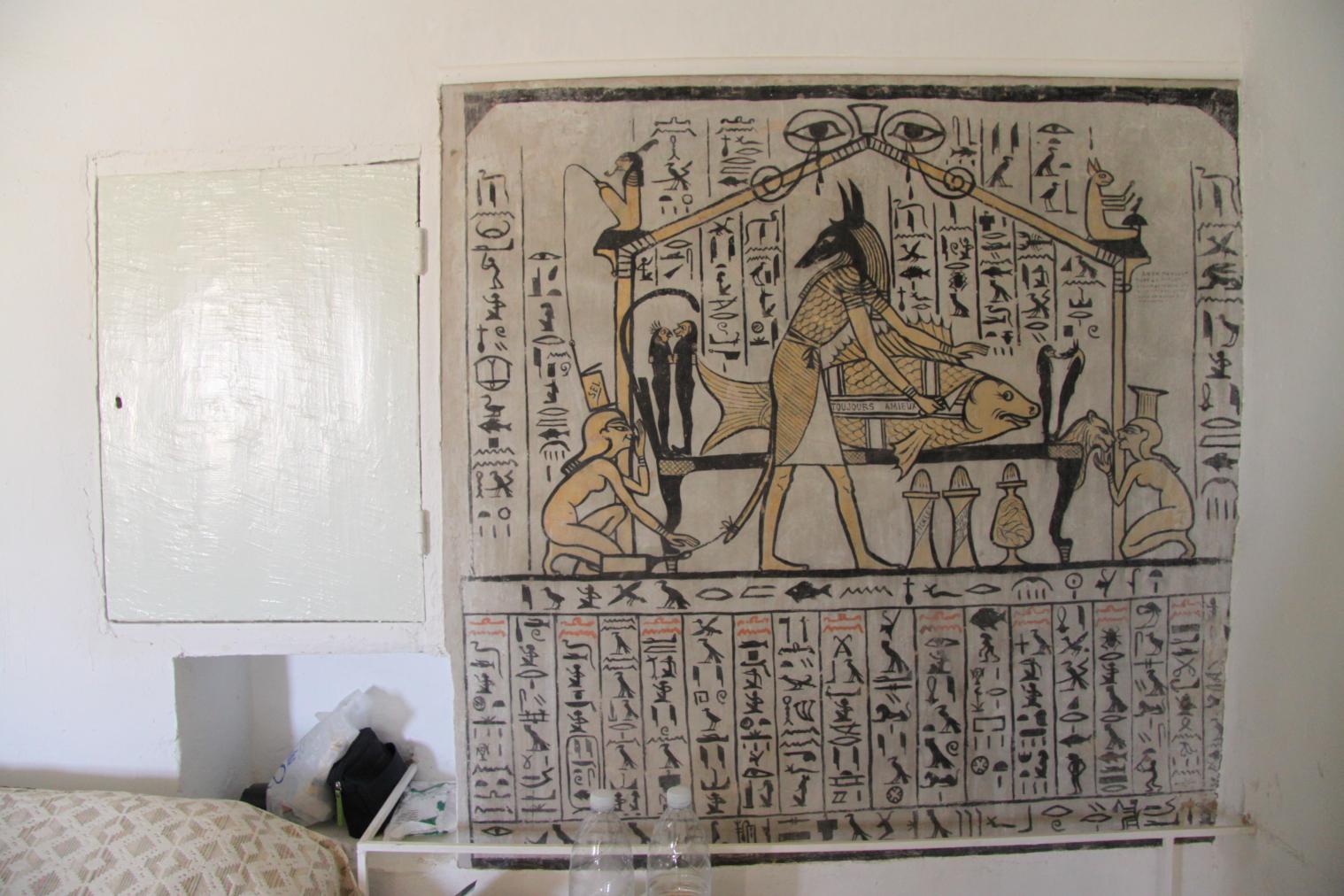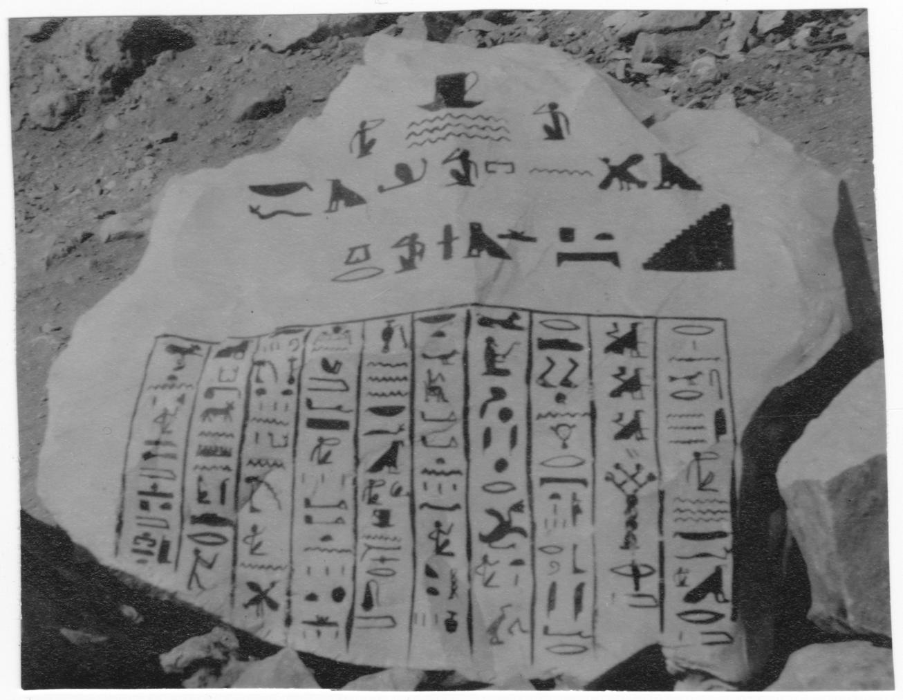 Jaroslav Černý had decorated a large limestone ostracon with hieroglyphic text describing, in the manner of ancient Egyptian prayer formulae, a wish for beer and coffee to be offered at the house. At the end of the text, the prayer is offered to Étienne Drioton. In one of the bedrooms of the dig house, Bernard Bruyère had painted a parody of an ancient Egyptian funerary scene. The scene depicts Anubis mummifying a giant fish. In this same scene, Nephthys is shown crouching and petting the chin of the lion head that forms part of the funerary bed; Isis cheekily giggles while tying a pot to Anubis’s tail. Some other humorous parts of the scene include two wedjat eyes surmounting the funerary canopy that are depicted as wearing pince nez glasses, while two pairs of the Sons of Horus appear to be locked in an embrace. In the accompanying hieroglyphic text, Bruyère had signed his name as the artist of the amusing painting. So rarely are we given a glimpse into the frivolity that surely took place at every dig house. It is certainly a mainstay element of dig life today!