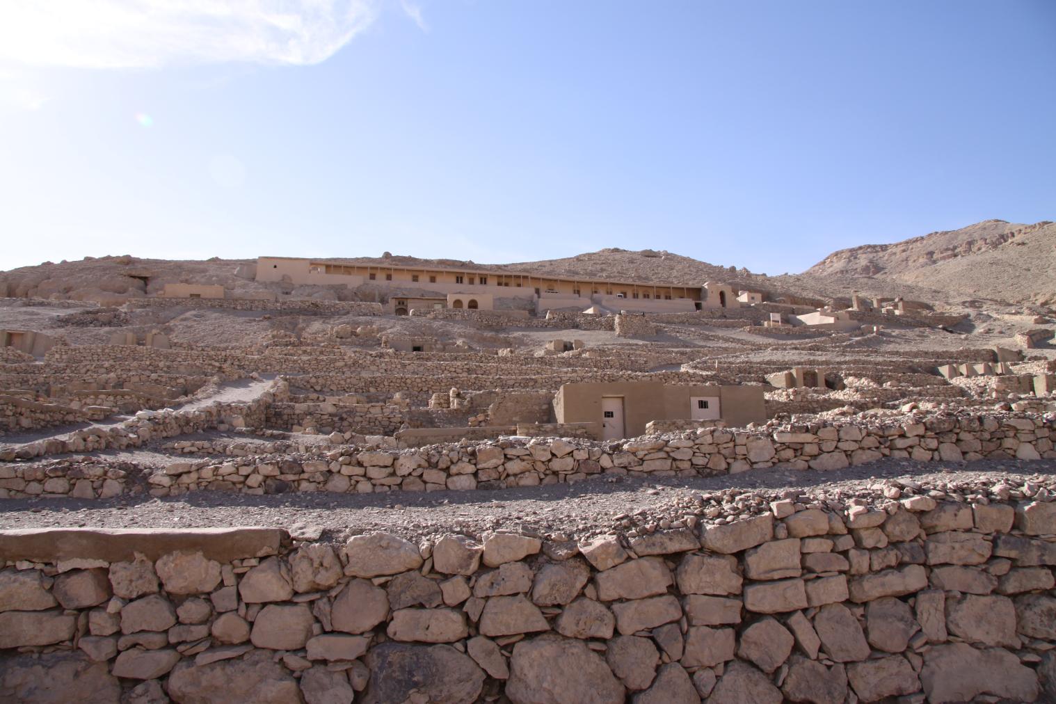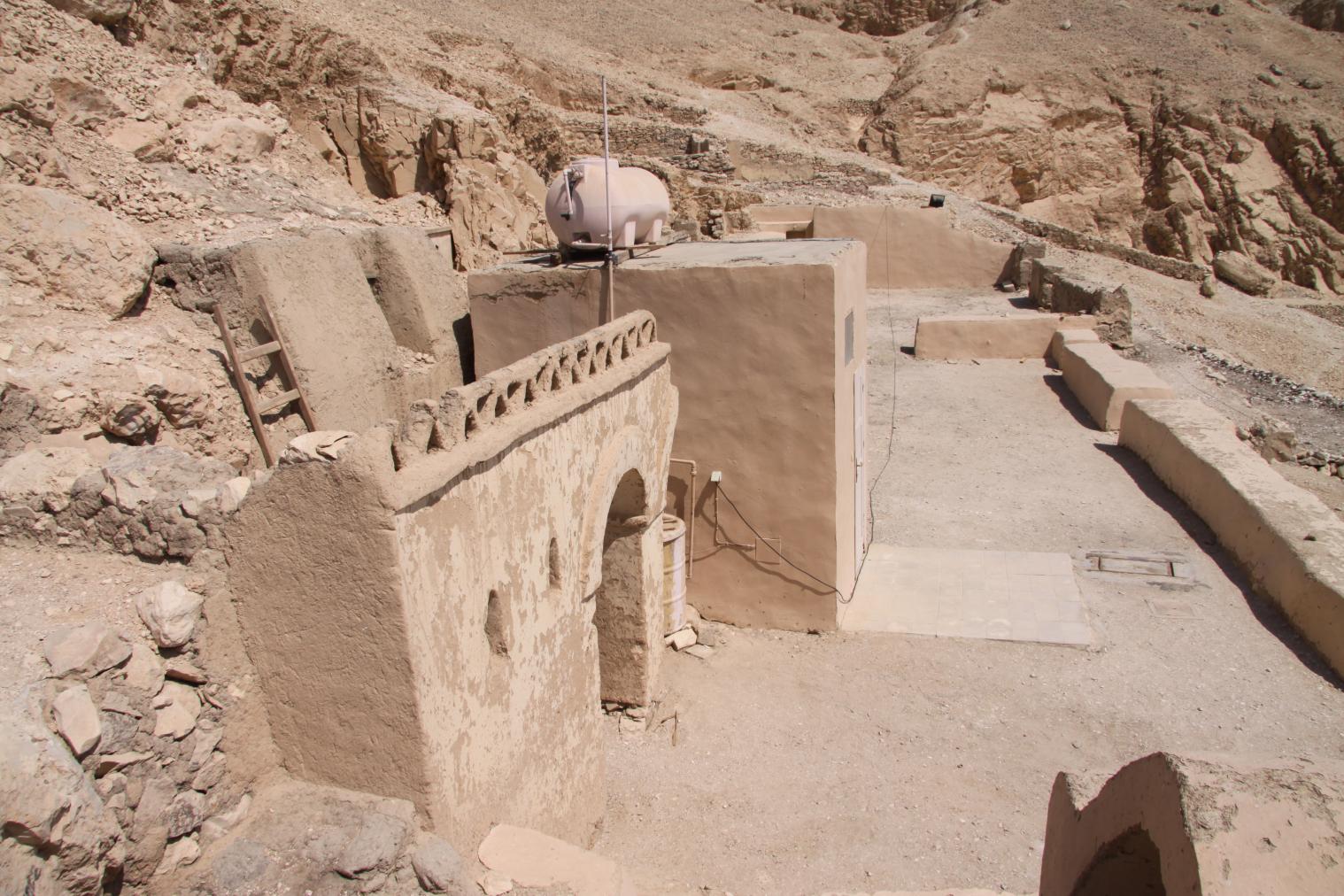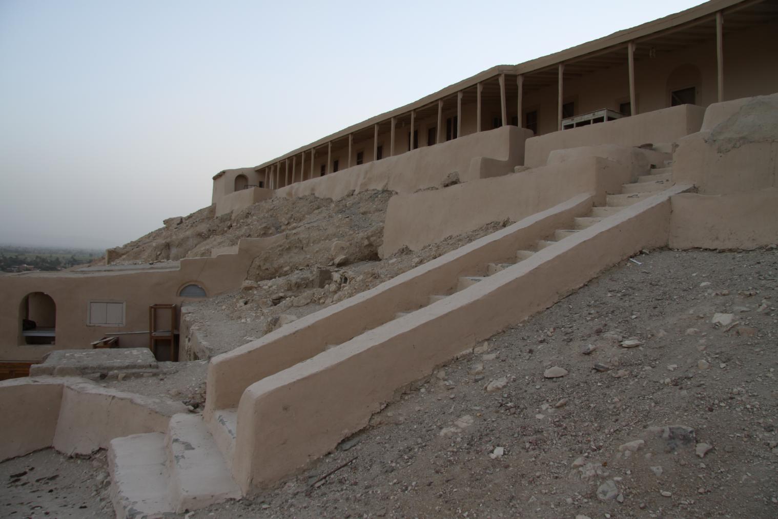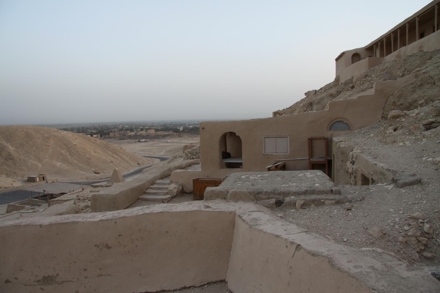 Bayt Madinah is the name applied to the dig house situated at Dayr al-Madinah. It is an elongated and narrow building set high along the cliff face that strikes a commanding presence where it overlooks both the ancient site Set-Ma’at, or “the Place of Truth”, the settlement wherein lived the tomb builders of the Valleys of the Kings and Queens, as well as the tombs of the same individuals. The house sits above an ancient tomb shaft and burial chamber, perhaps belonging to one of the tomb builders of Dayr al-Madinah.