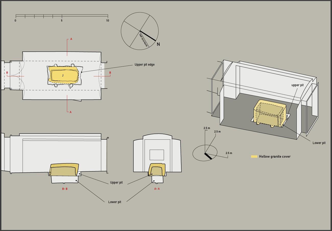 A two-tiered pit in the floor of the chamber, covered by a granite sarcophagus box, formed the burial place. The exterior sides and ends of the lid were incised and painted with the figures of Serqet, Neit, Nephthys, Isis and the four sons of Horus. Two semi-circular canopic jar emplacements were cut into the sides of the upper tier of the pit.