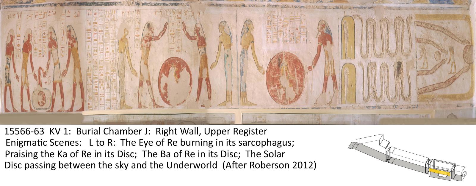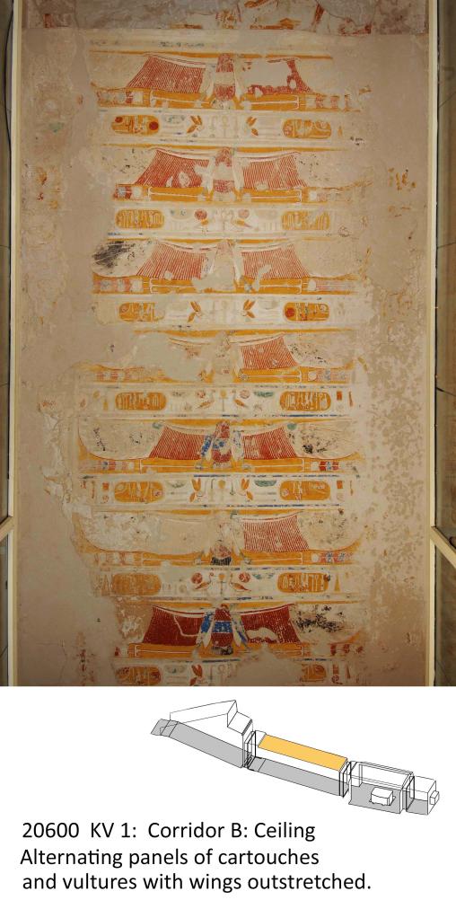 The entrance is cut into the base of a hill at the end of the first northwest branch Wadi. This unfinished tomb comprises an open entryway Ramp (A), corridor B, vaulted burial chamber J, and an unfinished chamber (K) with a rear recess. The walls are decorated with excerpts from the Book of Gates (chamber K), Book of Caverns (corridor B), Book of the Earth (burial chamber J), Opening of the Mouth ritual (corridor B), and the deceased with deities (corridor B, chamber K, burial chamber J). The ceilings are painted with motifs of flying vultures and astronomical figures. There are 135 Greek, and several Demotic, Coptic, and nineteenth century graffiti in the tomb, indicating that KV 1 has been accessible since antiquity.