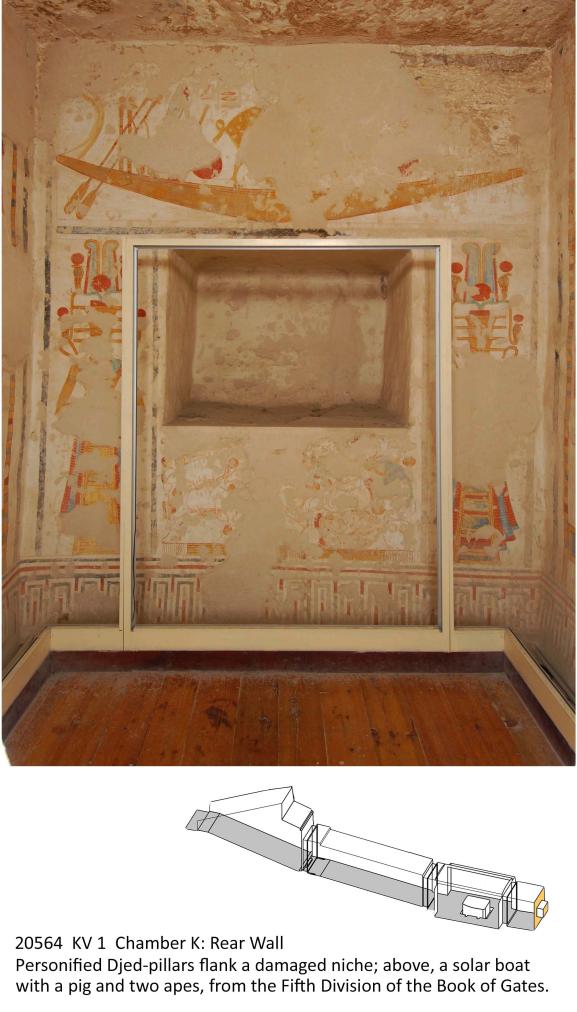 See entire tombThis small chamber, unfinished at the time of the king's death, may have been intended as another corridor. There is evidence of beam holes in the right (northeast) and left (southwest) walls. The left and right walls show the king offering to Osiris, and presenting an image of Ma'at to Osiris. A central recess in the rear (northwest) wall is flanked by personified djed-pillars with sacrificial animals in between. At the top is an extract from the fifth gate of the Book of Gates depicting a pig and two apes in the sun boat. The ceiling is decorated with cartouches and squatting deities. Pivot holes in the floor and ceiling inside the gate attest to the presence of a double leaf door.
